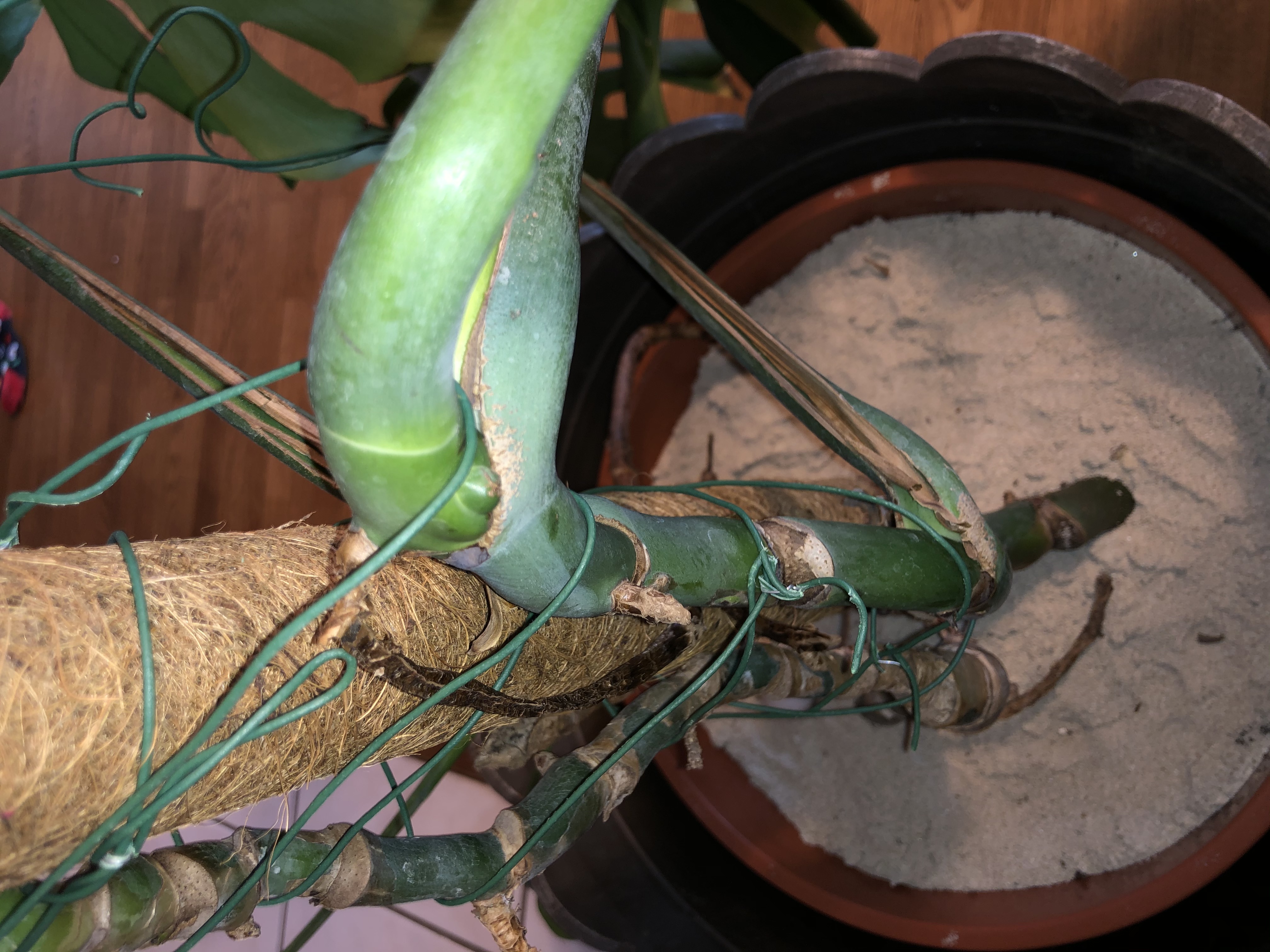 Ich habe vor gut drei Wochen eine Monstera Deliciosa aus einer Messie-Wohnung „gerettet“ (über Kleinanzeigen gefunden). Das gute Stück musste direkt umgetopft werden, auch wenn es zu dem Zeitpunkt draußen etwas frisch war (ca 6 Grad). Der Umtopfprozess hat etwa 10-15 Minuten in Anspruch genommen. Die Erde der Pflanze war dermaßen trocken, man konnte meinen sie hätte noch nie Wasser gesehen. Auch einer der zwei „Stämme“ war total ausgetrocknet, er ist beim rausholen einfach zerbrochen weil er so trocken war. Nunja, ich habe sie dennoch in ein Gemisch aus Palmen-, Blumen- und Anzuchterde gesetzt, und den abgebrochenen Stamm einfach auch eingepflanzt, die Luftwurzeln daran einfach in die Erde geführt. Generell hat sie aber kaum Lufwurzeln oder nur sehr verkümmerte. Ich hatte sie beim Umtopfprozess einmal gut gewässert und die Blätter abgeduscht. Zunächst ging es ihr gut, gegossen habe ich sie nach dem Umtopfen nur einmal, ansonsten nur die Blätter alle 3-4 Tage mit Regenwasser besprüht. Nach etwa einer Woche jedoch fing ein Blatt an braun zu werden und schließlich noch eines. Ich musste diese beiden abschneiden. In dieser Woche kam ein drittes dazu, dass ich abgeschnitten habe, aber an den Spitzen verfärben sich nun auch andere Blätter. Zunächst stand sie am Fenster (Südwest) aber vor der Heizung. Als die Blätter sich verfärbt haben, habe ich sie in die Raummitte gestellt, hier sind aber trotzdem an dunklen Tagen zwischen 200-450 Lux, an hellen um die 700-900 (je nach Sonne), unser Wohnzimmer ist sehr offen und hell. An einer Stelle bekommt sie scheinbar ein neues Blatt oder einen Seitentrieb, da wird sie seit einigen Tagen ganz „dick“. Am abgebrochenen Stammstück (mit den zwei kleinen Blättern) hat eins meiner Kinder leider auch noch das Blatt abgerissen... Natürlich an dem, wo ich das nächste Blatt erwartet hätte... Wird da überhaupt nun noch ein neues kommen? Was kann ich noch tun, damit es ihr besser geht?