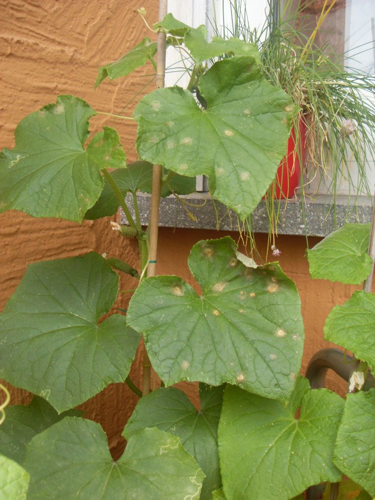 Dann habe ich gesehen, dass sich an den Blätter der Kletterzucchini weiße Flecken gebildet haben. Könnte es sich hierbei um Mehltau handeln