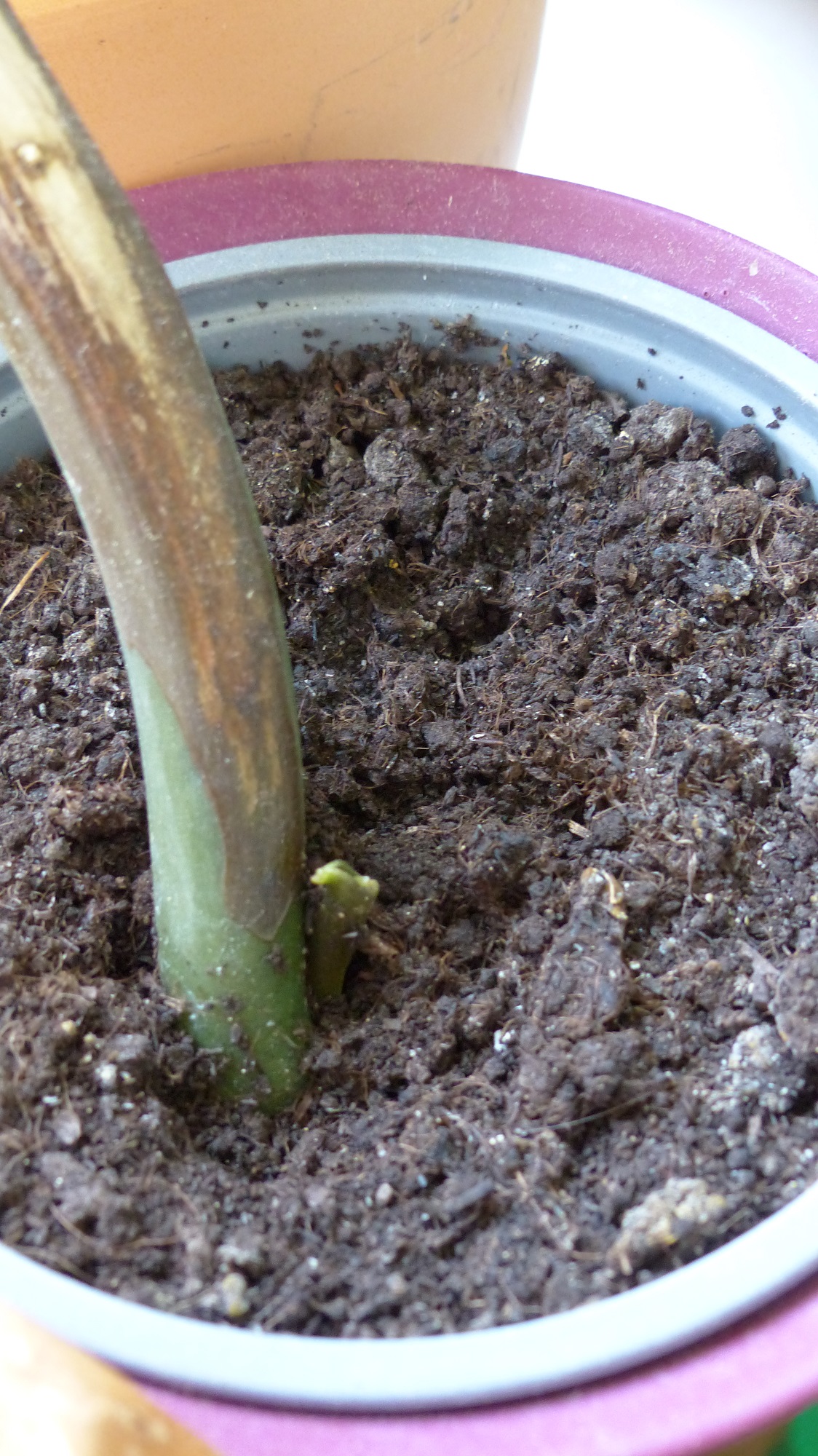 Nebenbei sind zwei Bätter abgebrochen, mal sehen, ob sie treiben.