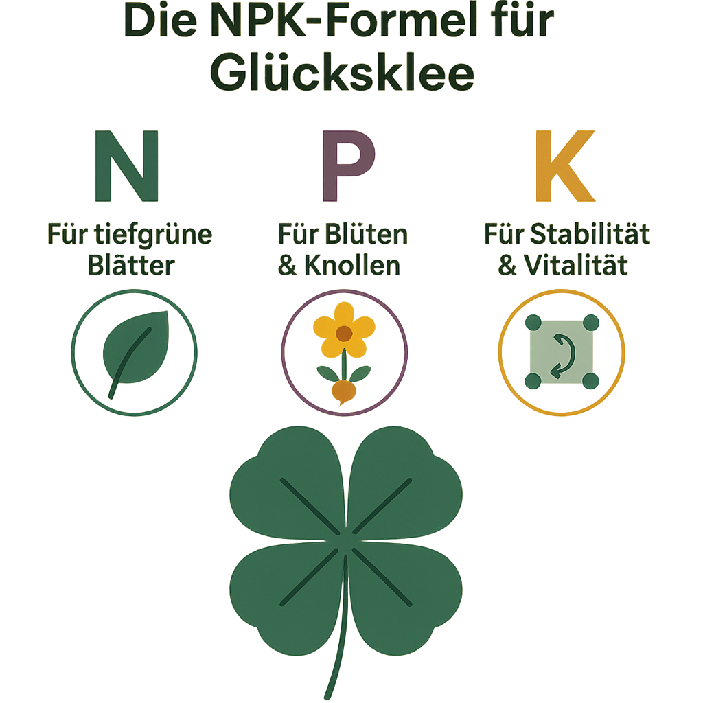 Die richtige Balance der Hauptnährstoffe Stickstoff (N), Phosphor (P) und Kalium (K) sowie der Spurenelemente ist entscheidend für die Gesundheit Ihres Glücksklees. Der