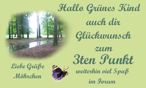Herzlichen Gückwunsch an Banu und Jura. Ich kann mich auch freuen. Ich hab auch vor kurzem meinen 3. renomeepunkt bekommen! vlg. grünes kind