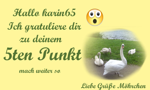 Hallo, na das nenn ich dann ja mal eine Überraschung. Da schaut man morgens ganz neugierig ins Forum und entdeckt dann auf einmal, das da ein Punkt mehr ist. Vielen Dank, kann ich da nur sagen. Ich freu mich sehr darüber. Gruß Karin65