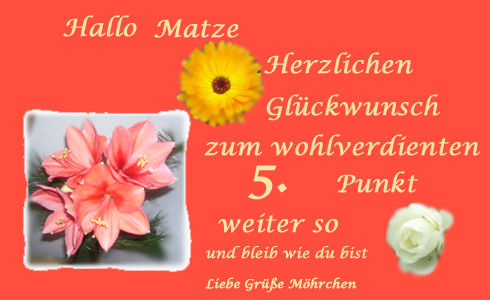 Zitat geschrieben von ChivaMatze hat 5 Punkte Herzlichen Glückwunsch!!!!!!!!!Schön, dass es Dich hier gibt!!!! Schöner kann ich es auch nicht sagen! Norbert