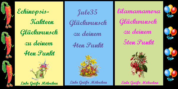 Vielen, vielen Dank für die Glückwünsche und für die netten Bewertungen. Den Punkt habe ich bei der Forenumstellung bekommen, aber ich werde ihn mir hoffentlich auch so verdienen!!