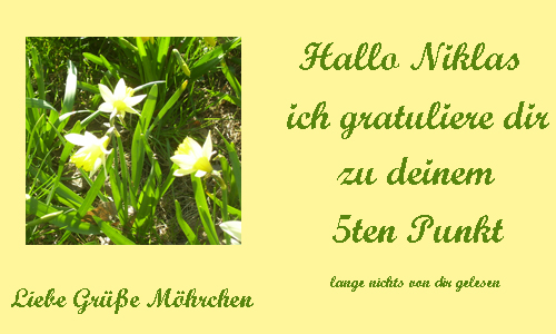 Niklas, auch von mir ganz herzliche Glückwünsche Bei der Forum-Umstellung haben ja viele einen Punkt dazubekommen. Was ist aber mit denen, die schon 5 haben?????