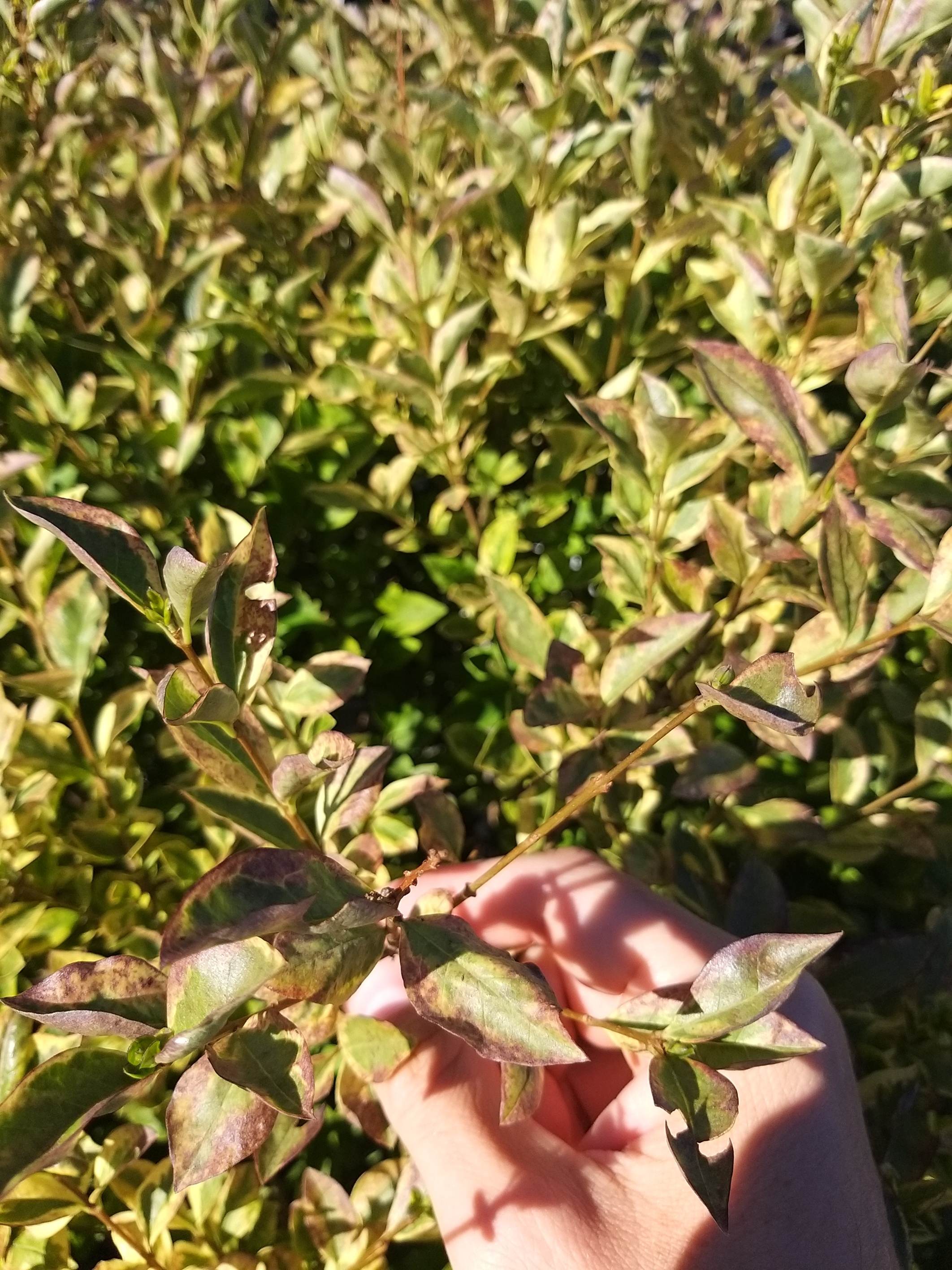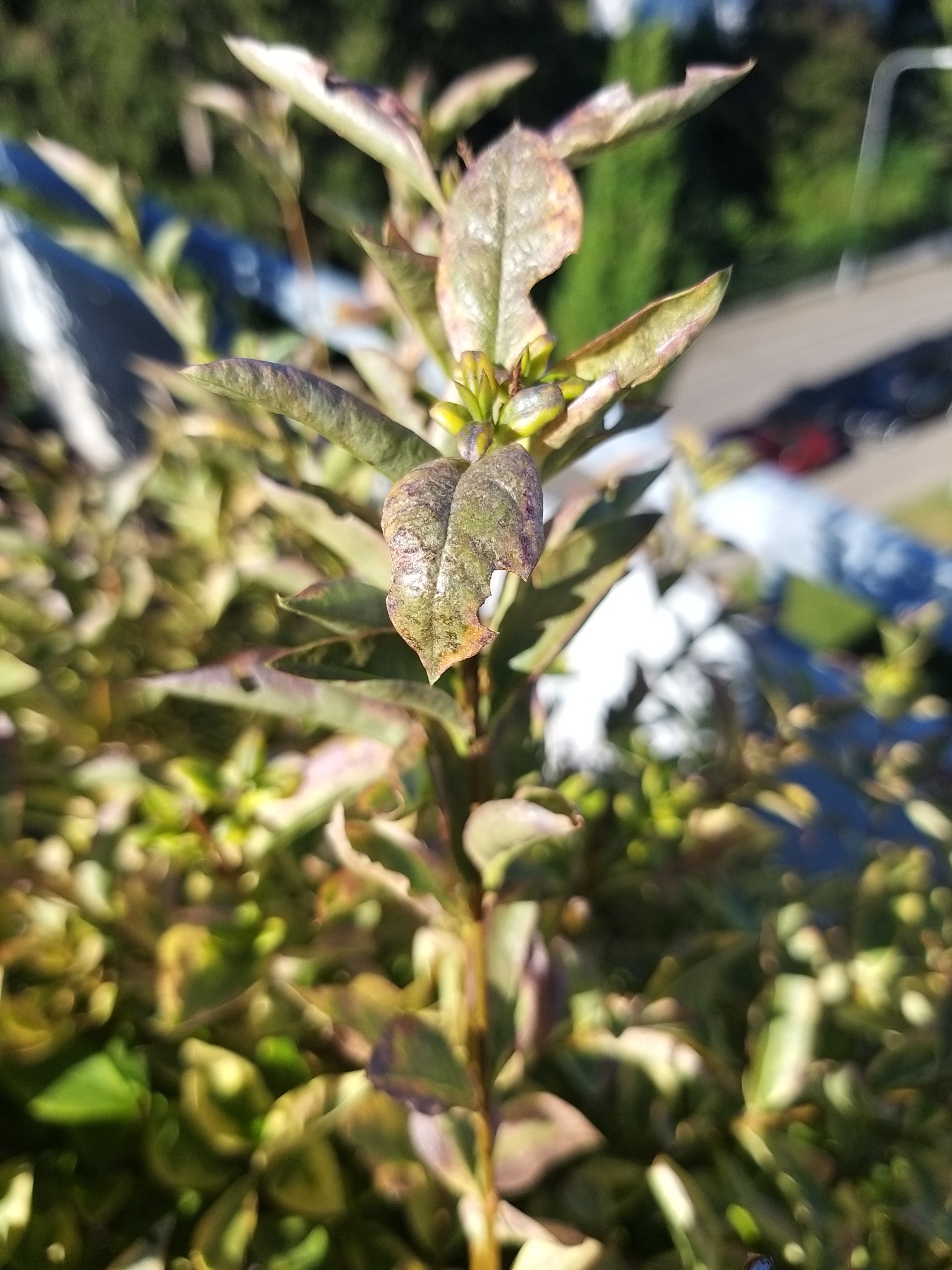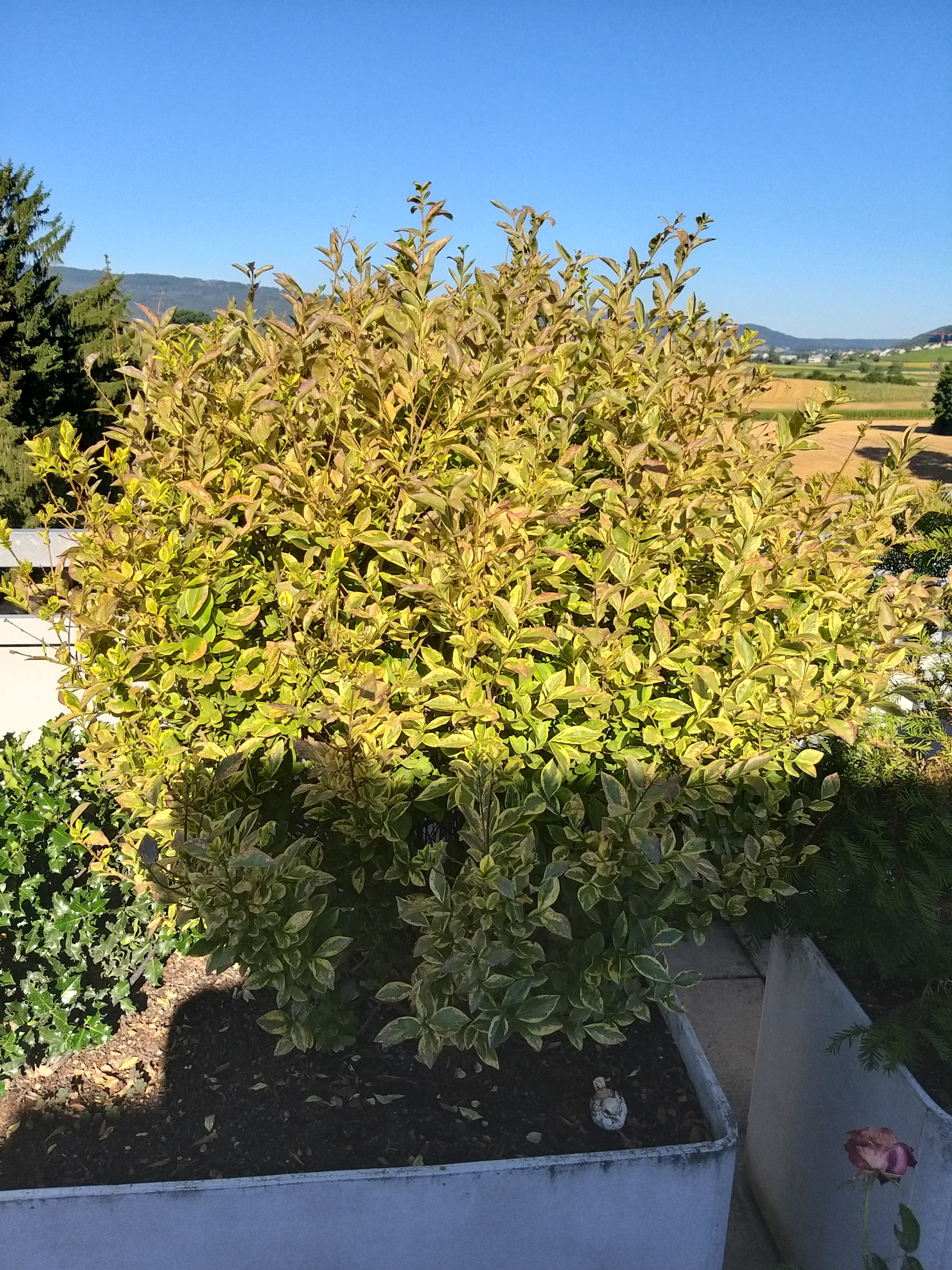 ich habe letztes Jahr zwei Gold-Liguster Sträuche gekauft. Sie stehen beide nebeneinander auf der Dachterrasse. Letztes Jahr haben sie sich beide prächtig entwickelt. Seit diesem Frühling kränkelt der eine Strauch leider sehr. Die Blätter haben den ganzen Glanz verloren und verfärben sich. Statt den glänzenden, grün-gelben Blättern sind die Blätter matt, rötlich bis grau verfärbt und rollen sich teilweise ein, bevor sie abfallen. Ich habe ein paar Bilder angehängt.
