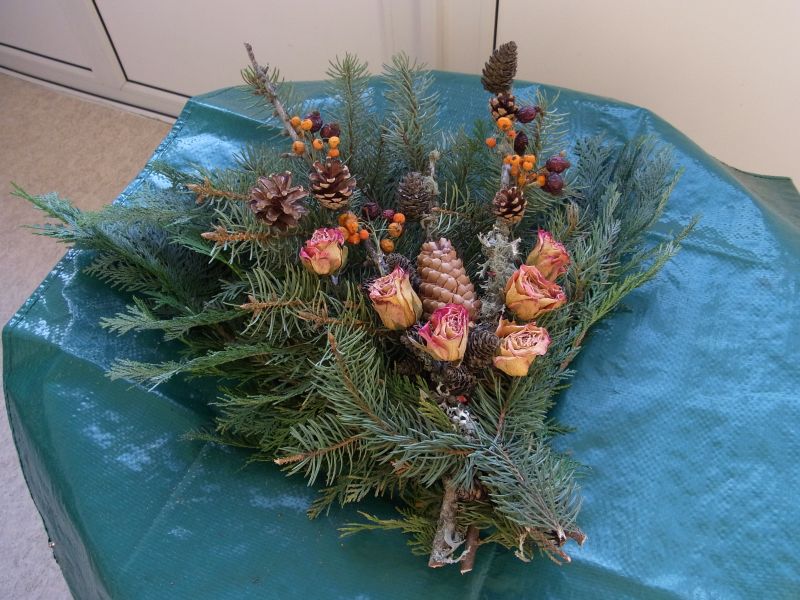 Ich stecke in Blumensteckschaum in einen 12er Tonblumentopf, ausgekleidet mit einem Stück Folie weil der ja unten ein Loch hat. Als Untergesteck dient alles was immergrün ist, vornehmlich Nordmanntanne, Kirschlorbeer und Eibe.