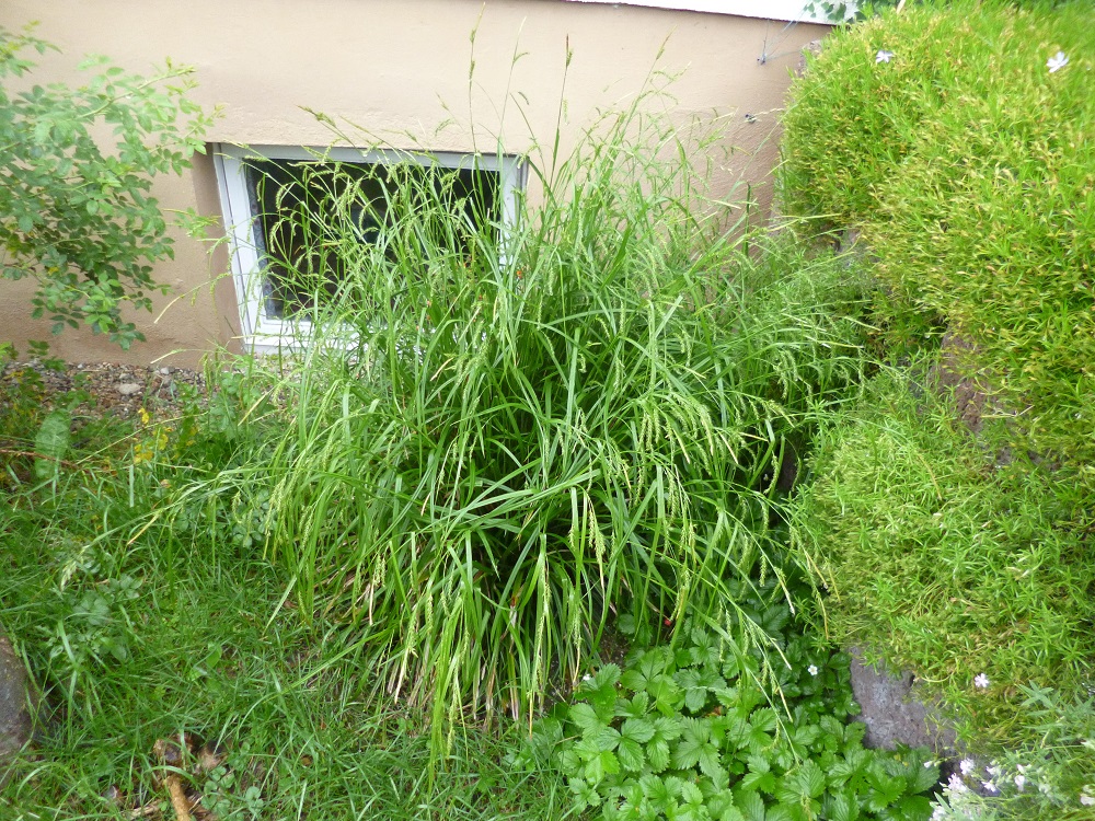 Ich hab hier ein Gras, das ist ziemlich hart. Es wächst überall, wo es feucht ist, aber auch in unserem Garten, wo der Boden sehr nährstoffarm und stellenweise sehr trocken ist. Der Boden auf dem Bild ist nährstoffarm und trocken. Zur Zeit blüht es. Ich wohne im Allgäu und dieser Sommer ist ziemlich nass und kalt. Im Querschnitt sieht es gewölbt aus mit einem Einschnitt in der Mitte.