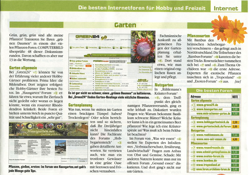 durch Zufall wurde mir mitgeteilt das in der Computerbild Ausgabe 16/2006 Foren bewertet wurden. Ein noch größerer Zufall war jedoch das green24 es auf die Note 1 geschafft hat.