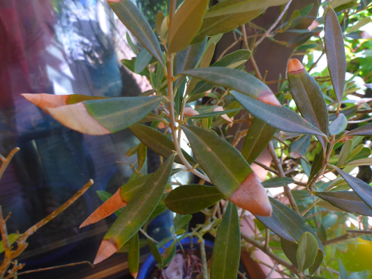 vor ein paar Jahren gekaufte Olivenbäumchen (bis -8° Toleranz) haben grünen Blag auf der Rinde und braune Blattspitzen. In milden WIntern bleiben sie draußen und werden nur bei Frostgefahr für ein paar Tage in den Wintergarten geholt. Sie stehen draußen vor dem Wintergaten unter einem Dachvorsprung und kriegen keinen direkten Regen ab. Sonne haben sie im Winter ab ca. 14 Uhr, im Sommer ab ca. 11 Uhr. Ich halte sie mäßig trocken.