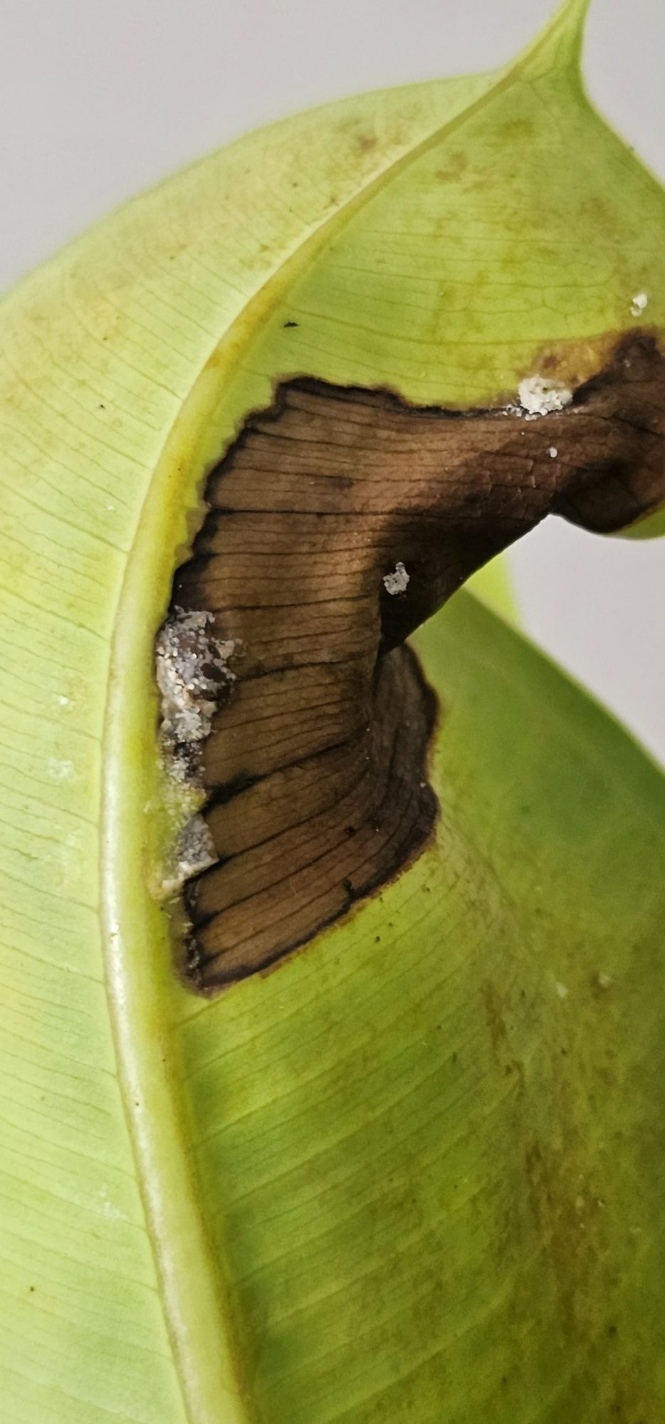 Er hat schwarze Flecken an Stamm und Blättern. Sondert weiße, fadenaritge und harte Ablagerungen am Stamm und an den Blättern aus. Die Blätter kleben aktuell besser als ein guter Uhu-Klebestift.