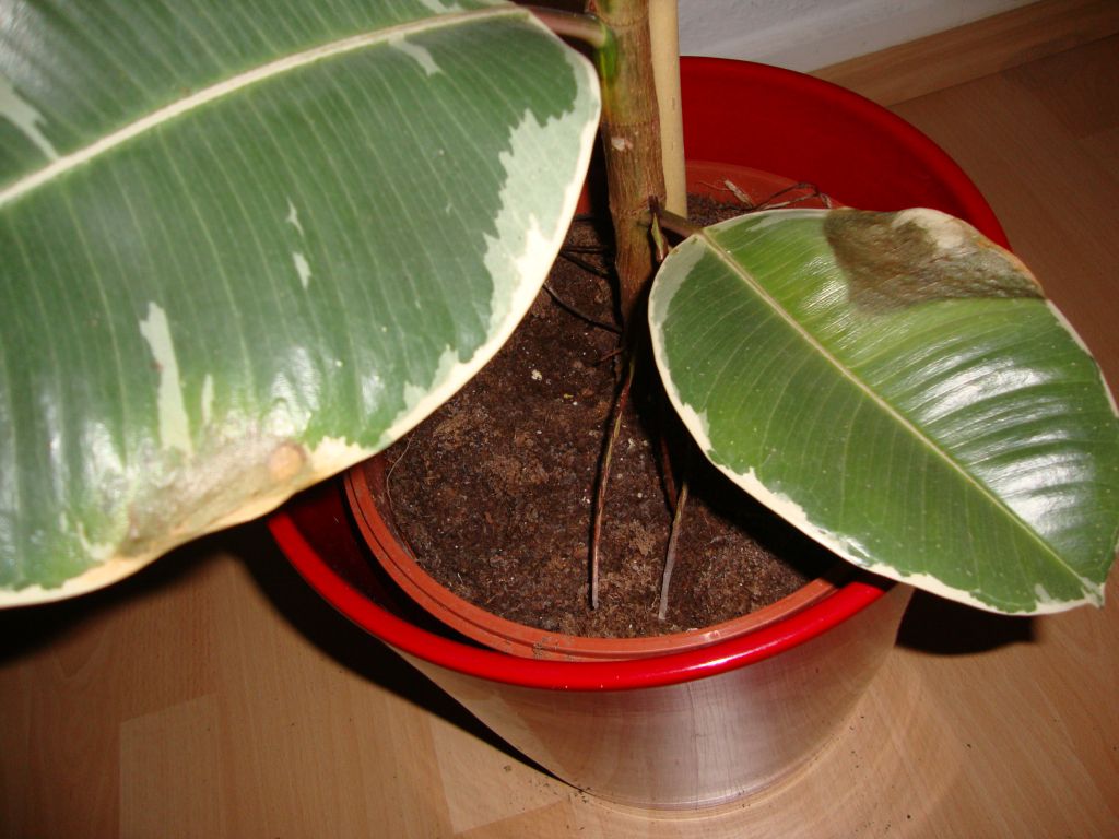 Aber schon kurz nach Einzug fing er an brandfleckähnliche Flecken zu bekommen, beginnend vom untersten Blatt und sich nach oben hinauf ausbreitend.