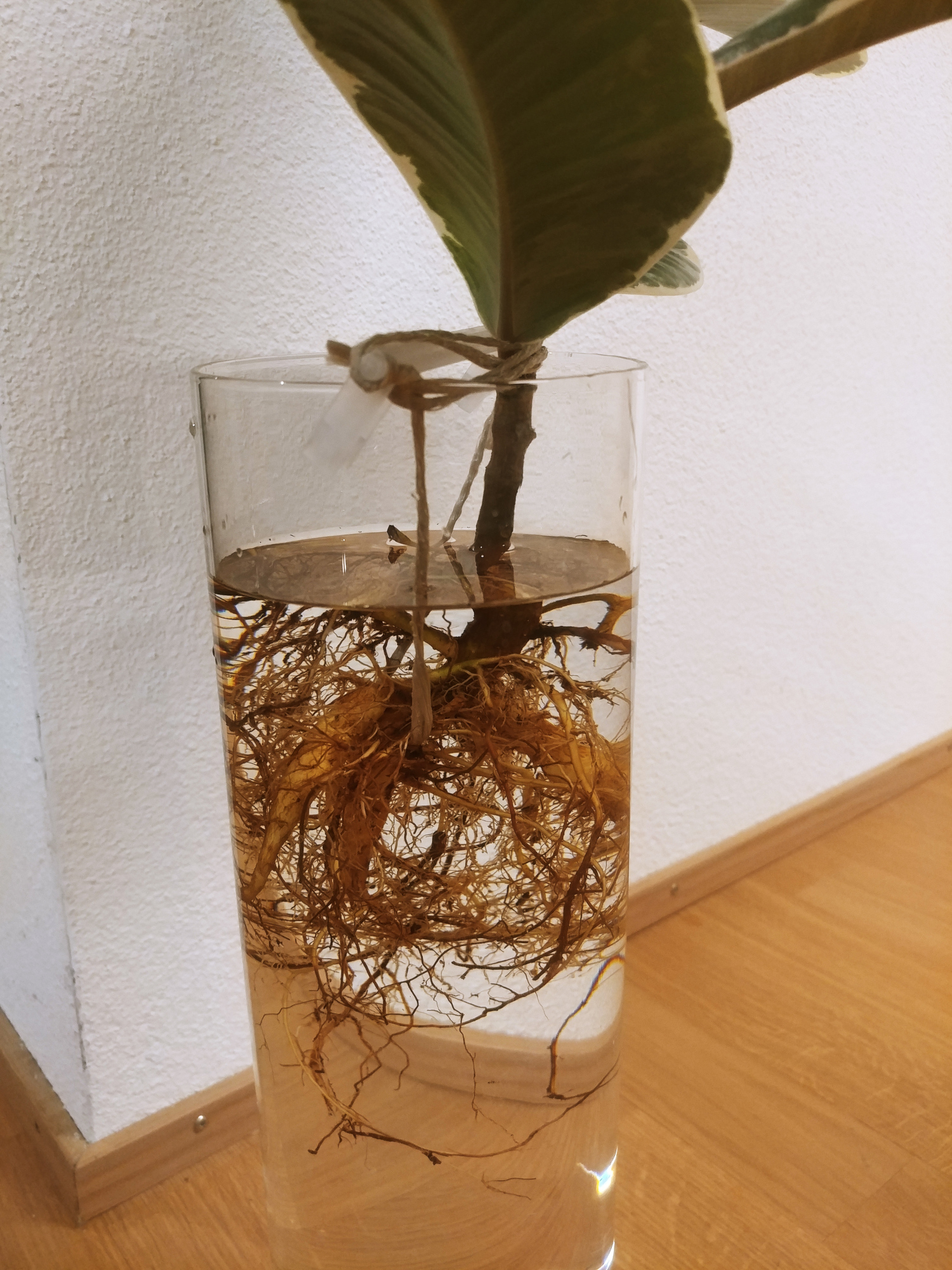 Jedenfalls lasse ich den Gummibaum erst mal so im Wasser. Ist er wohl sauber genug? ganz weg kriegt man die Erde ja sowieso nie. Den in Wasser stehen zu lassen nützt offenbar recht viel, um noch verbleibende Erdreste und tote Wurzeln raus spülen zu lassen. Die sinken über Nacht auf den Boden ab.