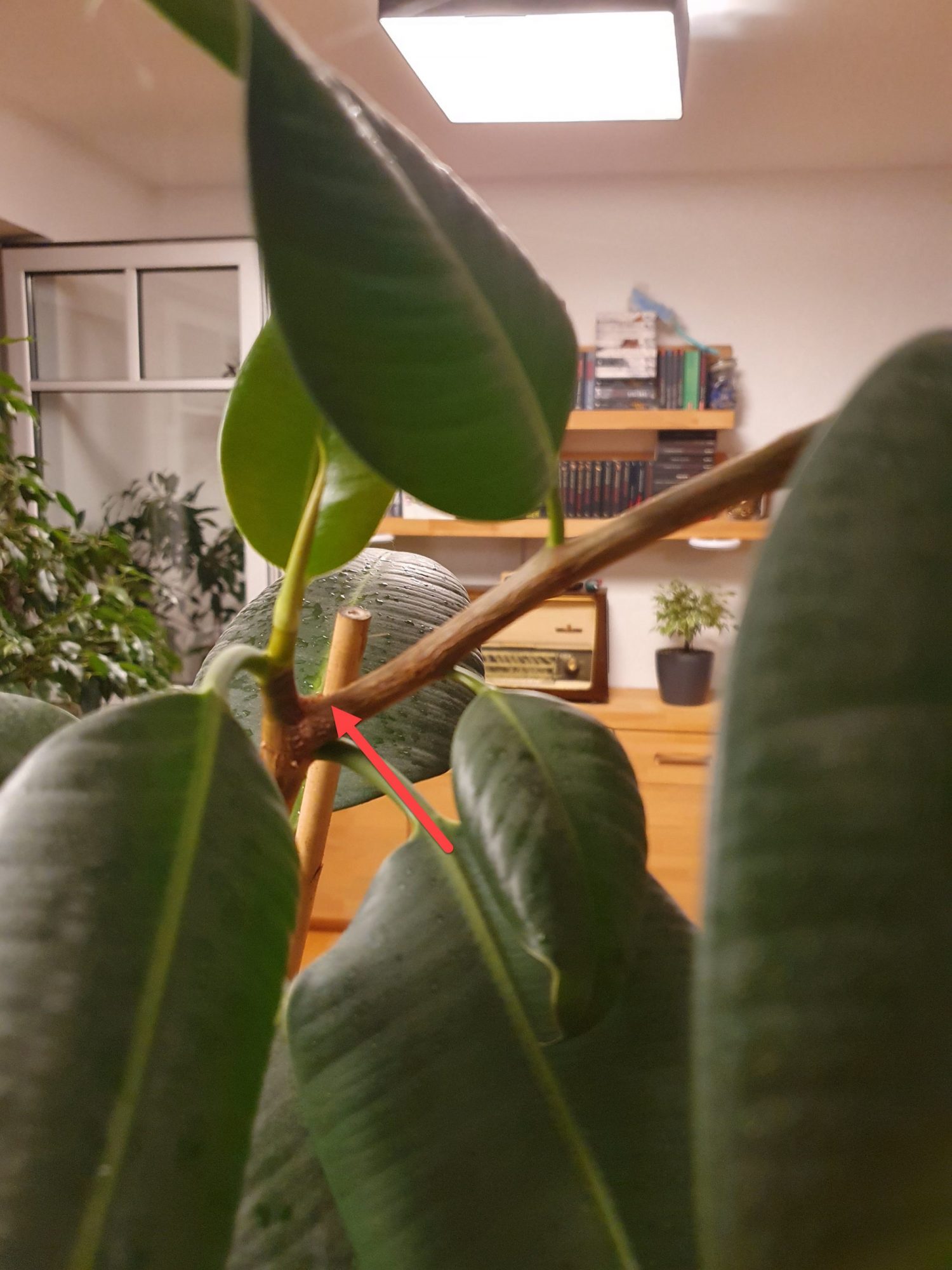Aber ich möchte meinen Gummibaum an der markierten Stelle trennen und den Ableger neu wurzeln lassen.