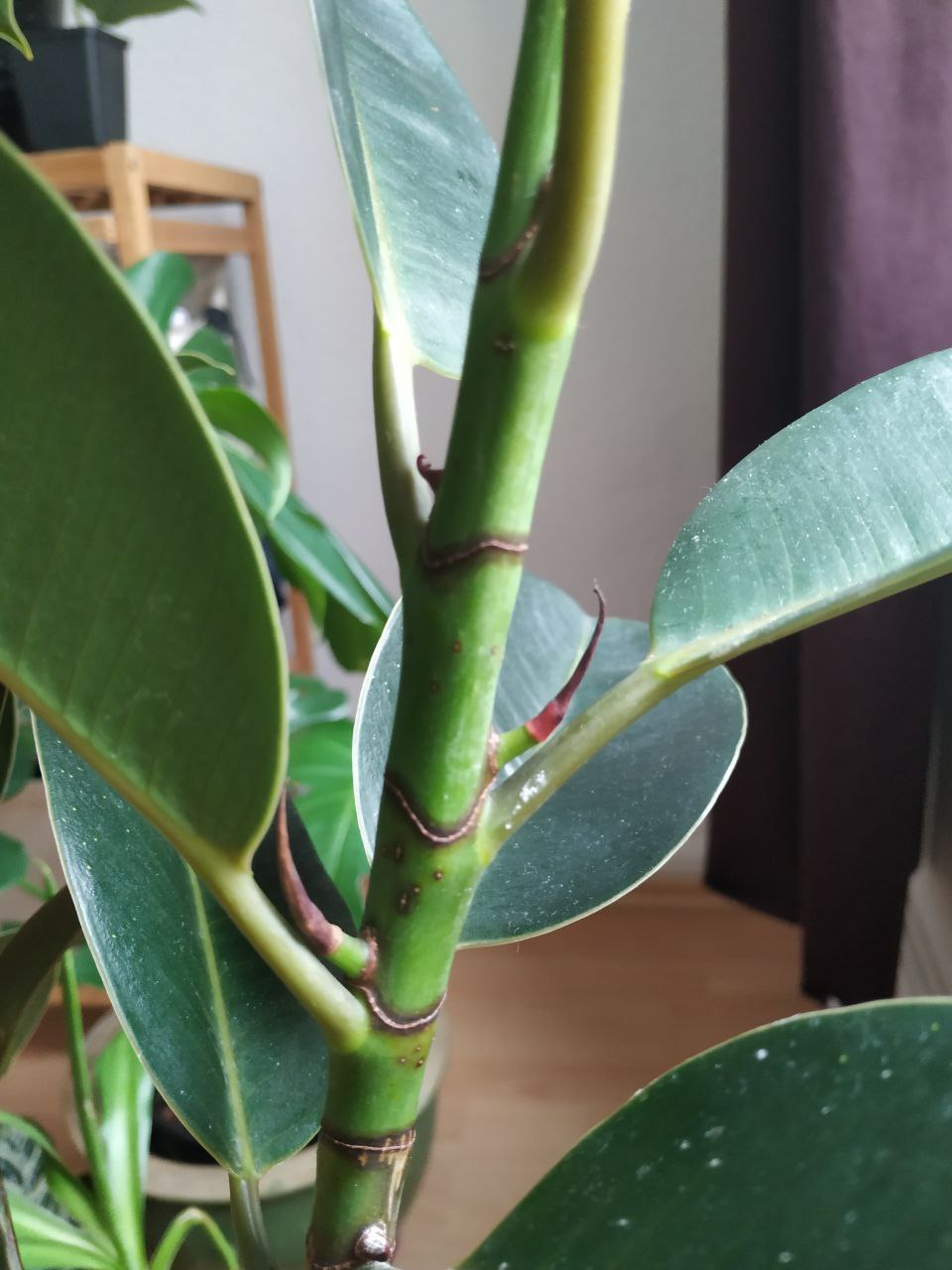 ich habe eine Frage zu meinem schönen Gummibaum. Ich habe ihn schon relativ lange und er hat nie Probleme gemacht. Nun ist es allerdings seit ein paar Wochen so, dass sich die kleinen verschrumpelten Blätter ganz unten knapp über der Erde leicht gelblich verfärben und schließlich abfallen, den oberen Blättern geht es gut, und der Abfall beschränkt sich auch nur auf den Bereich, wo der Stengel bereits verholzt (ist). Knapp an der Verholzungsgrenze setzt nun aber auch ein größeres Blatt leicht helle Stellen an (siehe Fotos).