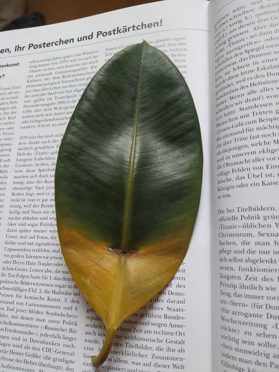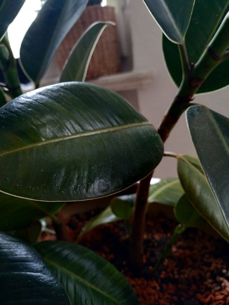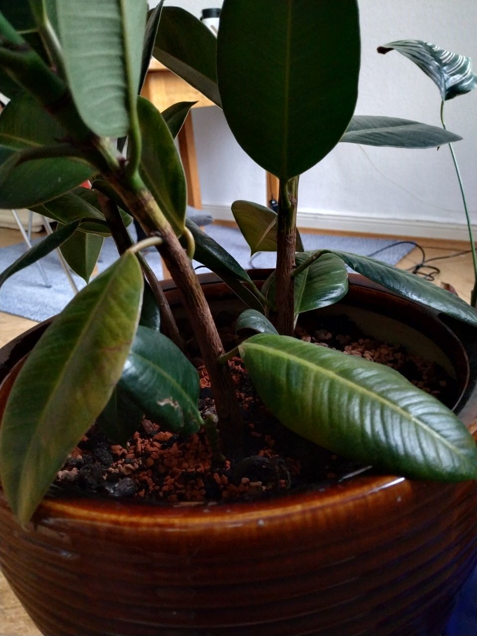 ich habe eine Frage zu meinem schönen Gummibaum. Ich habe ihn schon relativ lange und er hat nie Probleme gemacht. Nun ist es allerdings seit ein paar Wochen so, dass sich die kleinen verschrumpelten Blätter ganz unten knapp über der Erde leicht gelblich verfärben und schließlich abfallen, den oberen Blättern geht es gut, und der Abfall beschränkt sich auch nur auf den Bereich, wo der Stengel bereits verholzt (ist). Knapp an der Verholzungsgrenze setzt nun aber auch ein größeres Blatt leicht helle Stellen an (siehe Fotos).