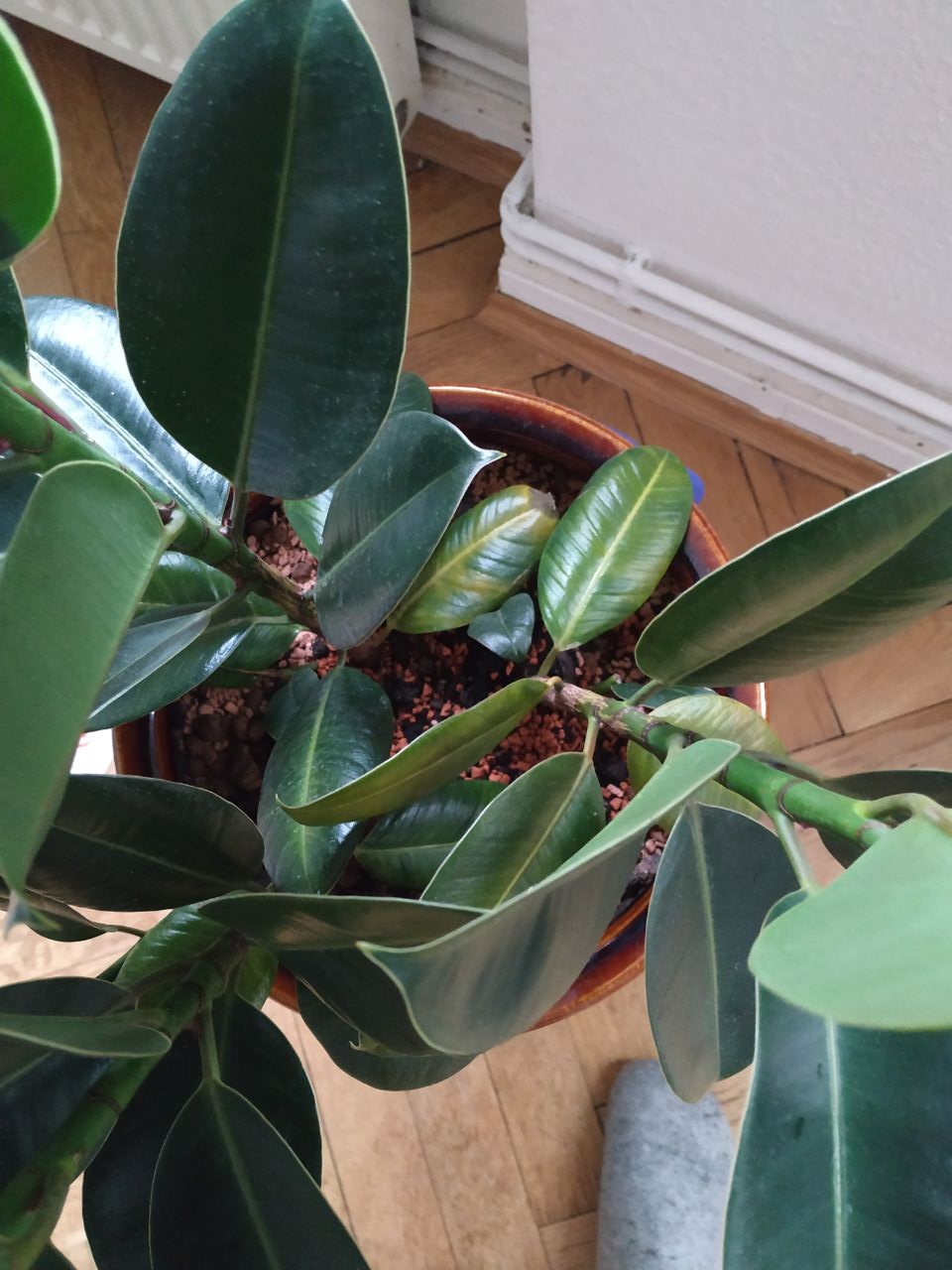 ich habe eine Frage zu meinem schönen Gummibaum. Ich habe ihn schon relativ lange und er hat nie Probleme gemacht. Nun ist es allerdings seit ein paar Wochen so, dass sich die kleinen verschrumpelten Blätter ganz unten knapp über der Erde leicht gelblich verfärben und schließlich abfallen, den oberen Blättern geht es gut, und der Abfall beschränkt sich auch nur auf den Bereich, wo der Stengel bereits verholzt (ist). Knapp an der Verholzungsgrenze setzt nun aber auch ein größeres Blatt leicht helle Stellen an (siehe Fotos).