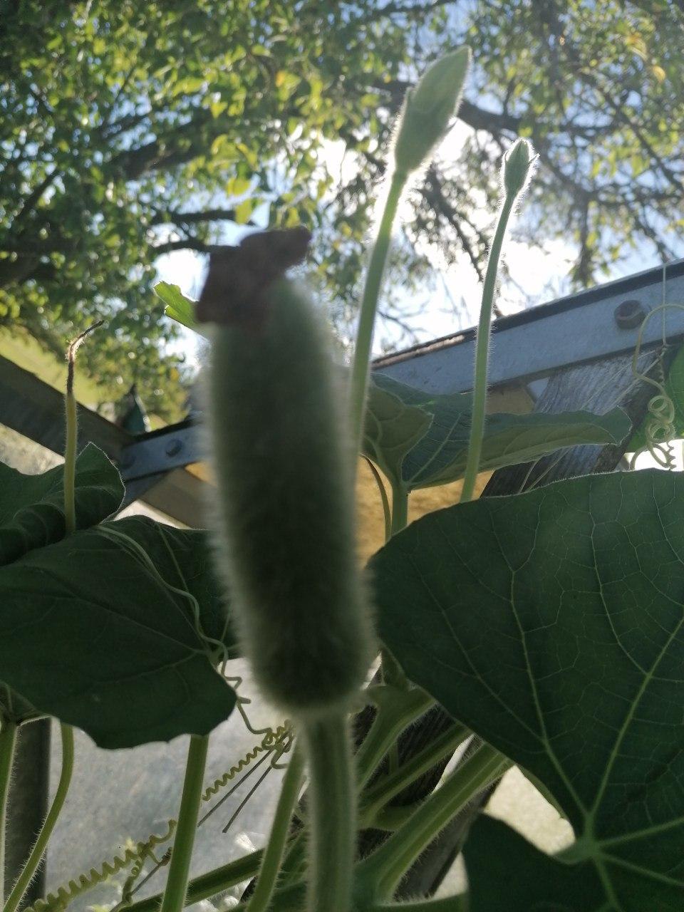 ich habe im Gewächshaus eine mittlerweile riesige Pflanze mit Früchten dran, aber leider den Zettel verschlampt, auf dem der Name stand. Die Früchte sind bisher etwa fingerlang und stark und weich behaart. Weiße Blüten und lustige Korkenzieherarme. Was könnte das sein? Danke euch!