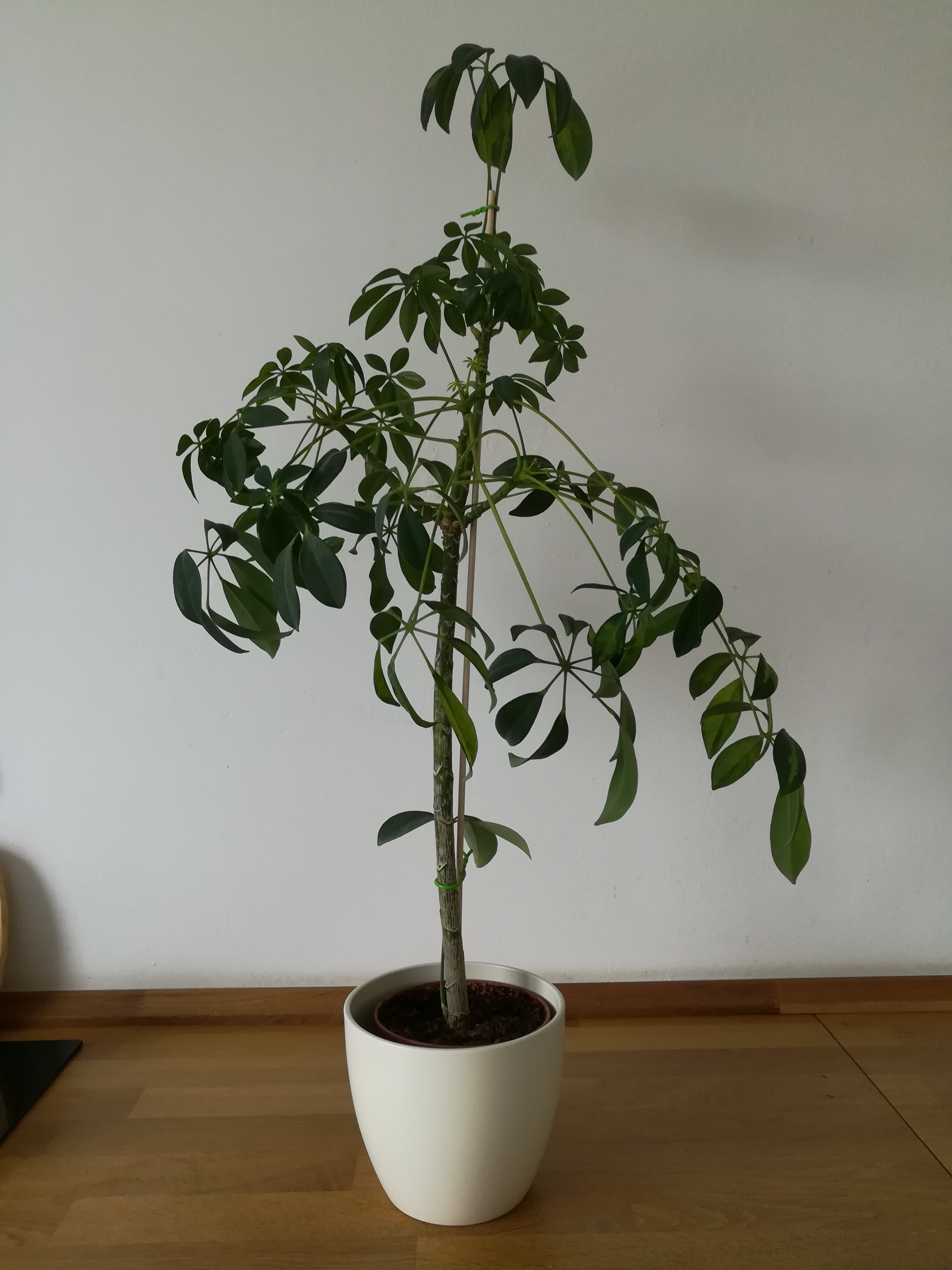 ich habe vor etwa zwei Jahren eine Schefflera bekommen, die bisher gut wuchs. Der Standort ist ab dem späten Nachmittag sonnig. Ich habe je nach Bedarf gegossen und hierbei auch Flüssigdünger gemäß Anleitung verwendet. Die Blätter sind strahlend grün und es kommen auch immer wieder neue Triebe und Blätter, die aber z. T. später wieder herunterhängen. Ich dachte anfangs, dass das auf die Größe zurückzuführen wäre und habe versucht, die Wuchsrichtung durch das „Hochbinden“ zu beeinflussen, habe aber das Gefühl, auf dem Holzweg zu sein. Wäre es ratsam, die Pflanze einmal umzutopfen? Oder zu beschneiden? Wenn nein, hat jemand eine Idee, was ich machen kann? Schädlinge habe ich keine gefunden.