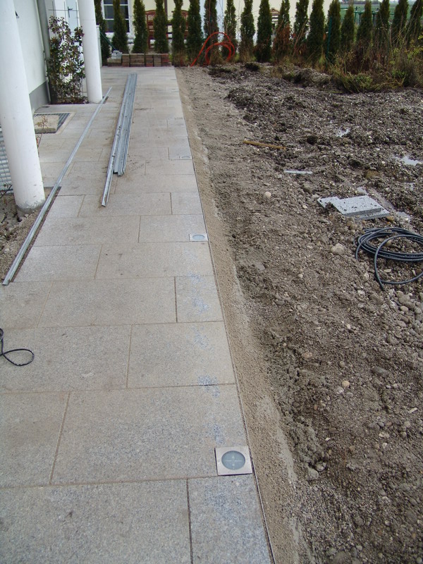 Fremdkörper find ich jetzt auch ein harte Bezeichnung für eine vielleicht 3 mm Edelstahlkante zwischen Rasen und Pflaster. Rasen ist noch nicht da, aber ich denke wie unauffällig es werden wird kann man schon erahnen. Vorteil man versetzt eben den Betonkeil recht weit nach unten und so kann das Gras ans Pflaster wachsen. Wenn der Garten fertig ist, kann ich euch gerne noch mal Bilder zeigen. Sinn davon ist nur, dass das Gras nicht in die Fugen wächst oder auch ins Beet, also reine Arbeitserleichterung..