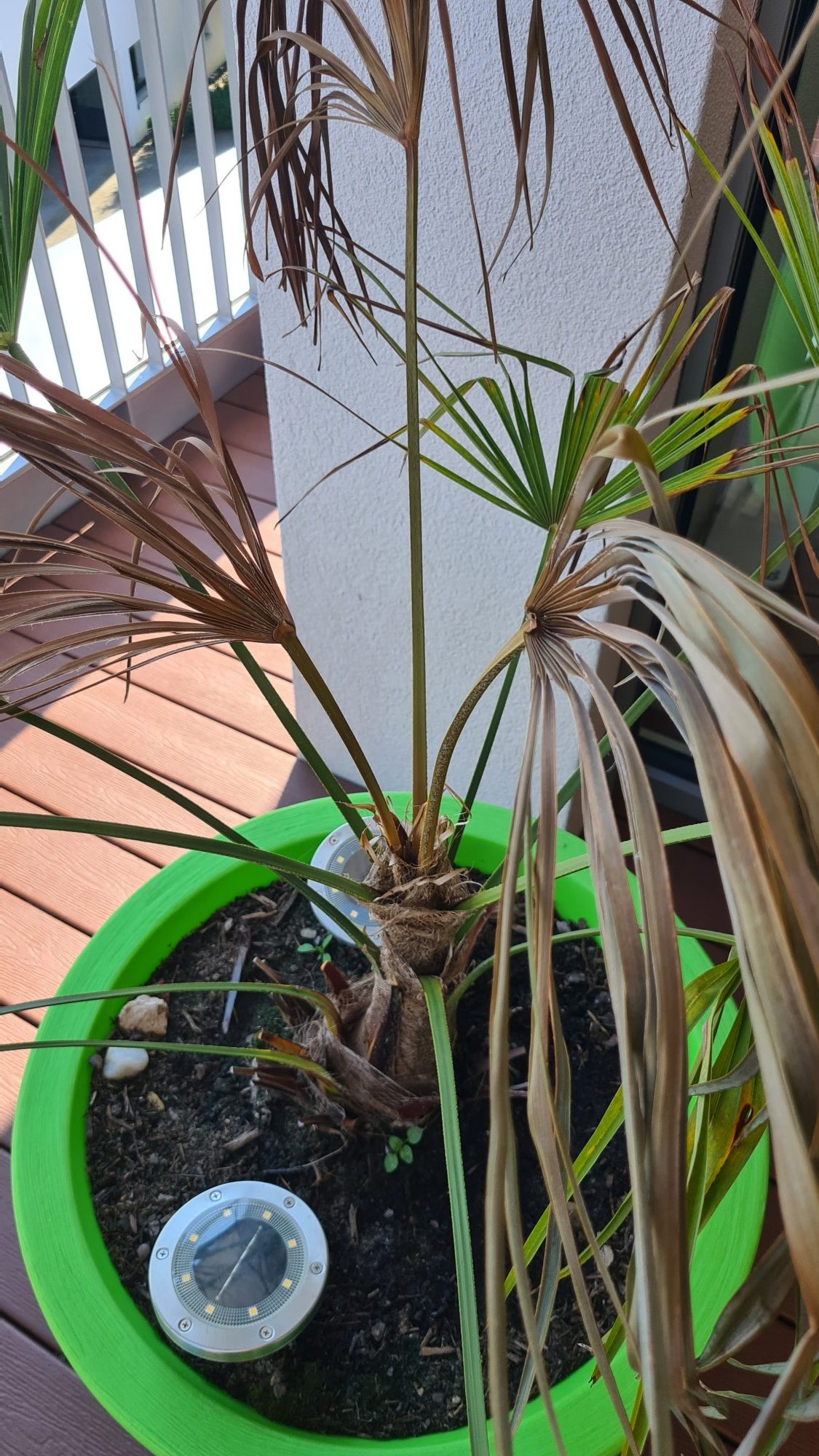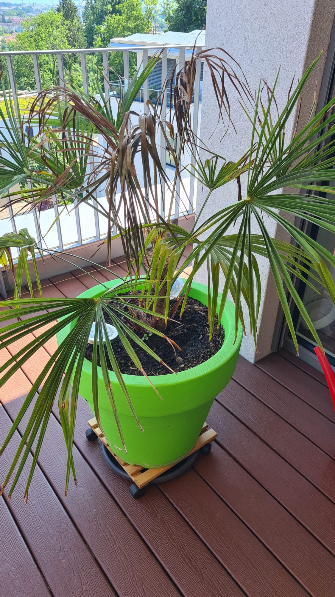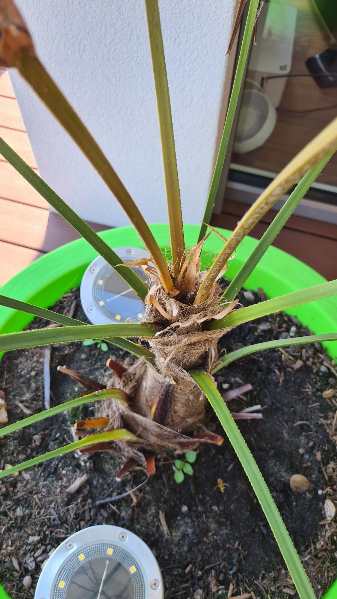 Leider hat unsere kleine Hanfpalme den Winter draussen nicht gut überstanden, sie war zwar gut gegen die Kälte geschützt, aber wir haben sie viel zu wenig gegossen und verpasst, dass sie am Standort keinen Regen abbekommen hat und die Erde komplett ausgetrocknet ist.