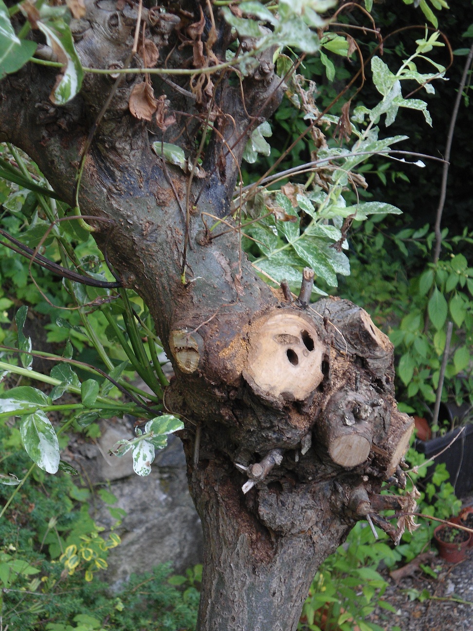 Heute nun hat meine Mutter zur Säge gegriffen und die tote Krone abgesägt. Dabei fielen Löcher im Holz auf, sie scheinen wie Fraßgänge tiefer ins Holz zu führen. Schädlinge konnte ich weiterhin keine ausmachen.