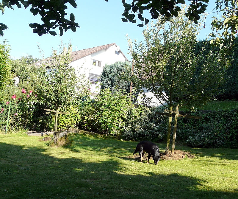 gekauft haben wir die bäume in der baumschule als halbstämme, wobei mir gesagt wurde, ich solle so tief wie zuvor pflanzen. an der birne liegt die veredelungsstelle direkt über der erde, beim apfel muss ich morgen mal schauen, war mir eigentlich sicher, dass es da auch so war. gut - fehler 1 + 2 wären erkannt. zu tief gepflanzt und den grasschnitt nicht sorgfältig genug vom stamm ferngehalten. zwar schichte ich immer einen ring um den baum, aber hund, katze und amseln arbeiten auch mit.