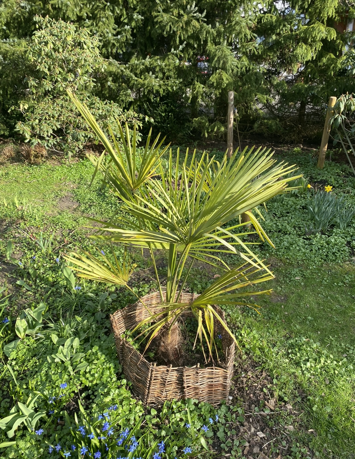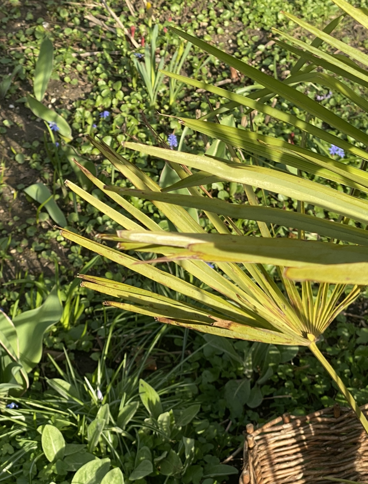 Jetzt nach dem Winter sieht die Palme leider so aus wie auf den angehängten Bildern. (Wer sich über das kleine Zäunchen wundert. Das ist eigentlich zum Schutz der Palme vor meiner Katze gedacht