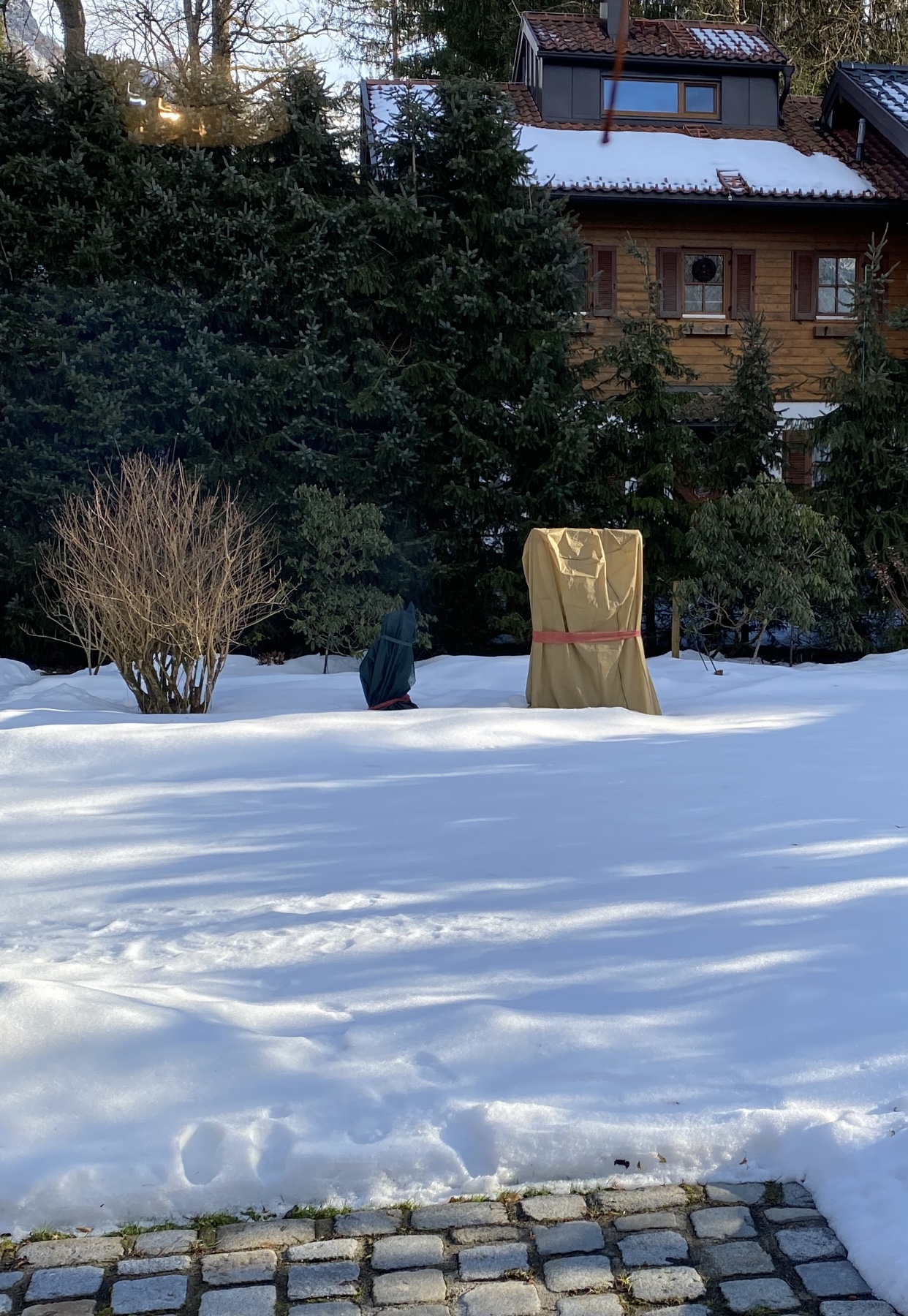Als dann der Winter näher rückte habe ich mich so gut es ging Informiert und die Palme so gut wie möglich Vorbereitet. Ein Holzgestell rundherum aufgebaut und da eine Vlies Decke darüber gestülpt die bis zum Boden ging. Den kleinen Stamm habe ich mit einem Heizschlauch umwickelt den ich angeschaltet habe sobald weniger als -6 Grad vorhergesagt waren. Ausserdem Wurde der Stamm noch separat mit Vlies umwickelt. Den Wurzelbereich habe ich mit Laub und Tannenzweigen gut bedeckt.