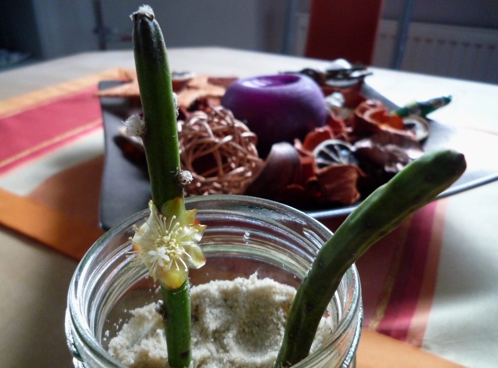 Nachdem ich die oberen beiden Glieder der Grandiflora abgedreht hatte und in Vogelsand gesteckt, werde ich doch tatsächlich bei einem der Steckis mit einer Blüte belohnt. Sie sieht aus wie eine Miniatur-Strohblume.