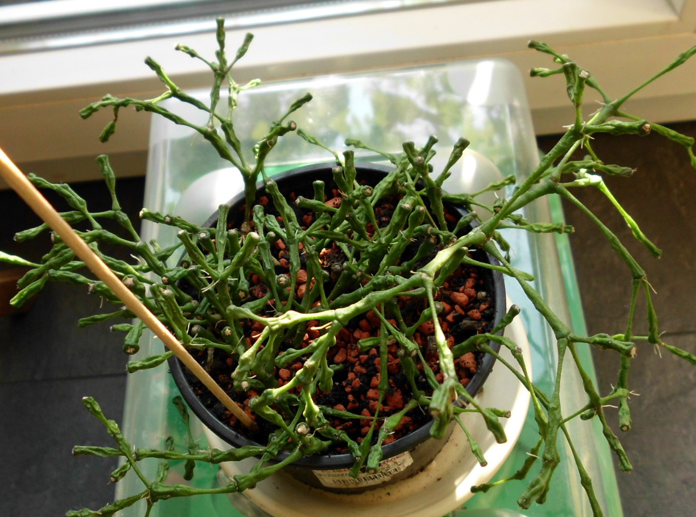OK, übersprühen statt Gießen, wird befolgt Und dann aber nicht ins Zimmergewächshaus stellen? Die weißen Stellen sind komischerweise auf dem Bild auffälliger als in Natura. Ich denke an den Stellen waren vorher Triebe oder auch Blüten?