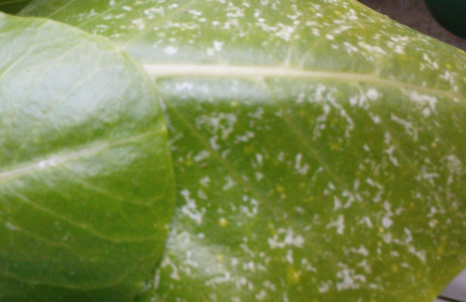Seit längerer Zeit ist sie von 2mm kleinen schmalen Schädlingen mit saugend-stechenden Mundewerkzeugen befallen. Ansich scheint es ihr nicht sonderlich viel auszumachen, da kein Blätter abgeworfen werden. Man sieht jedoch, dass die Blätter von weiß bis durchsichtigen "Flecken" bedeckt sind, sieht so aus als ob sich an diesen Stellen die Wachsschicht anlöst.....