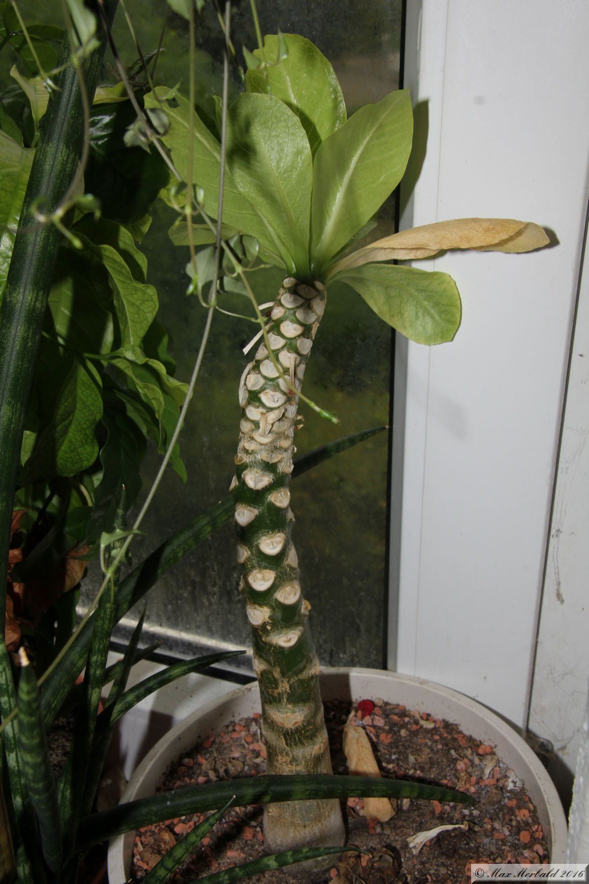 meine Brighamia macht schon auf Sommerpause. Sie hat die meisten Blätter abgestoßen. Der Stamm fühlt sich fest und gesund aus, es sollte sich also nix fehlen. Jetzt sollte ich also weniger gießen.