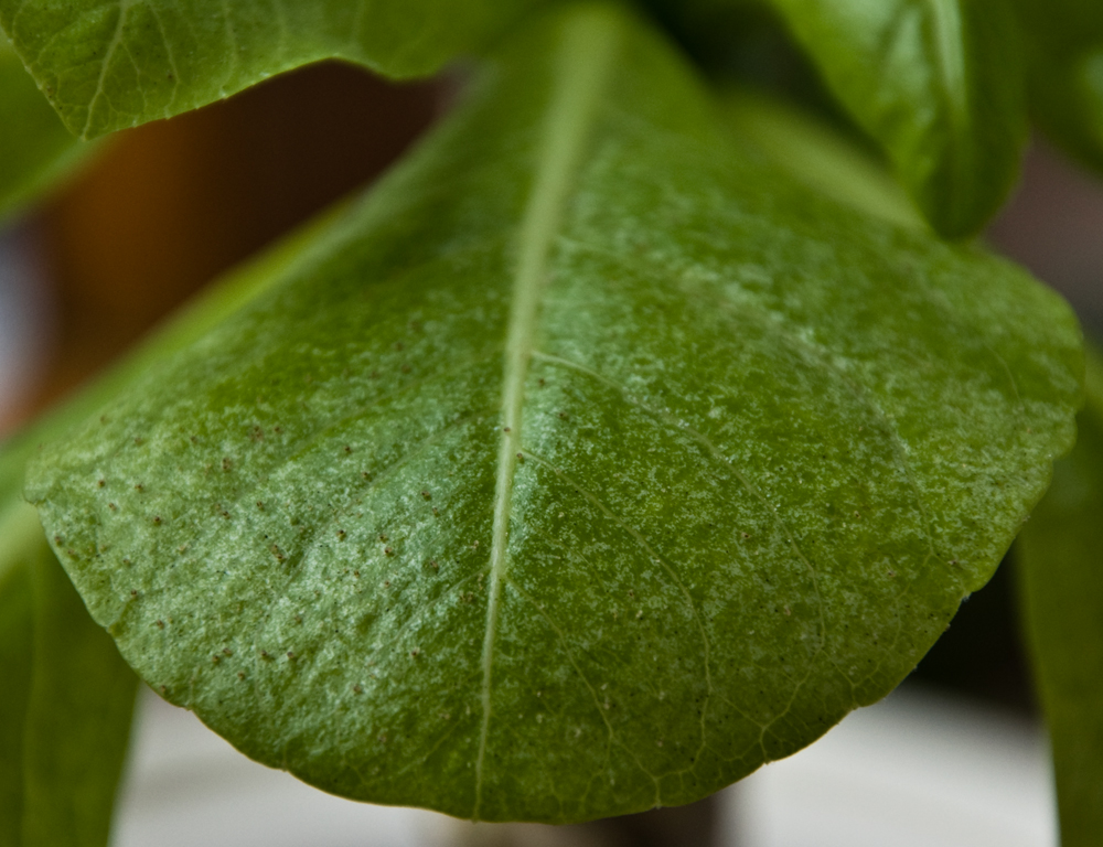 Jetzt haben beide(!) weiße Flecken auf den Blättern, die man wie Kalkflecken beschreiben könnte. Außerdem haben sie kleine braune Punkte die man im Querschnitt auch vom Blatt stehen sieht.