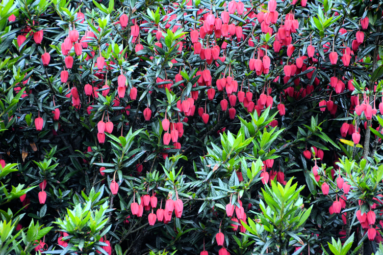 Solch einen Baum/Strauch habe ich noch nie gesehen; wie überdimensionales Heidekraut. Ich konnte nicht näher herangehen, daher weiß ich nicht genauer, wie die Blätter aussahen und ob es ein Baum oder Strauch ist. Er war jedenfalls 2-3m hoch , die hängenden Blüten bestimmt 5cm groß.