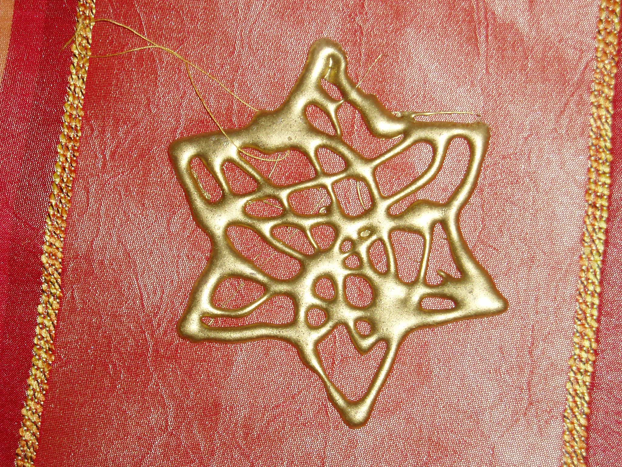 Eine Vorlage - wird mit hellem Backpapier überdeckt. Das Papier mit Büroklammern feststecken, um Verrutschen zu vermeiden. Mit der Heißklebepistole die Konturen des Sternes nachfahren und vom Rand her die Innenfläche kreuz und quer füllen. Je nach Geschmack dünnere oder dickere Kleberfäden.