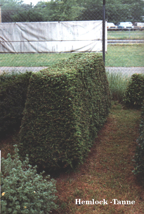 Na ja - Hemlock-Tanne - als Hecke hat schon ihre Reize. Sie wirkt, wenn sie nicht ganz straff geschnitten ist - bedeutet: wenn der junge Trieb länger gelassen wird - irgendwie weicher, lockerer im Gegensatz zu Fichten oder anderen Arten.