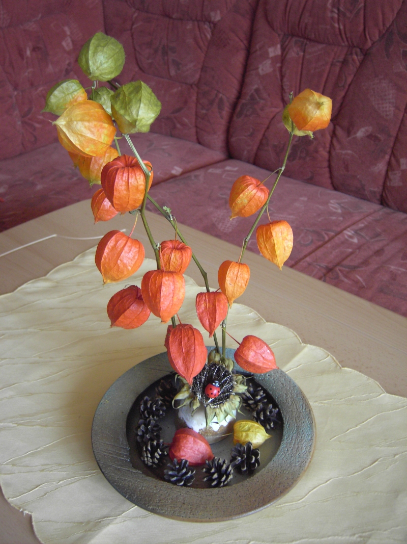 Lampionblumen - schneiden, kopfüber zum Trocknen aufhängen, nach ca. 3 Wochen abnehmen, die Blätter entfernen und Stiele zurecht schneiden