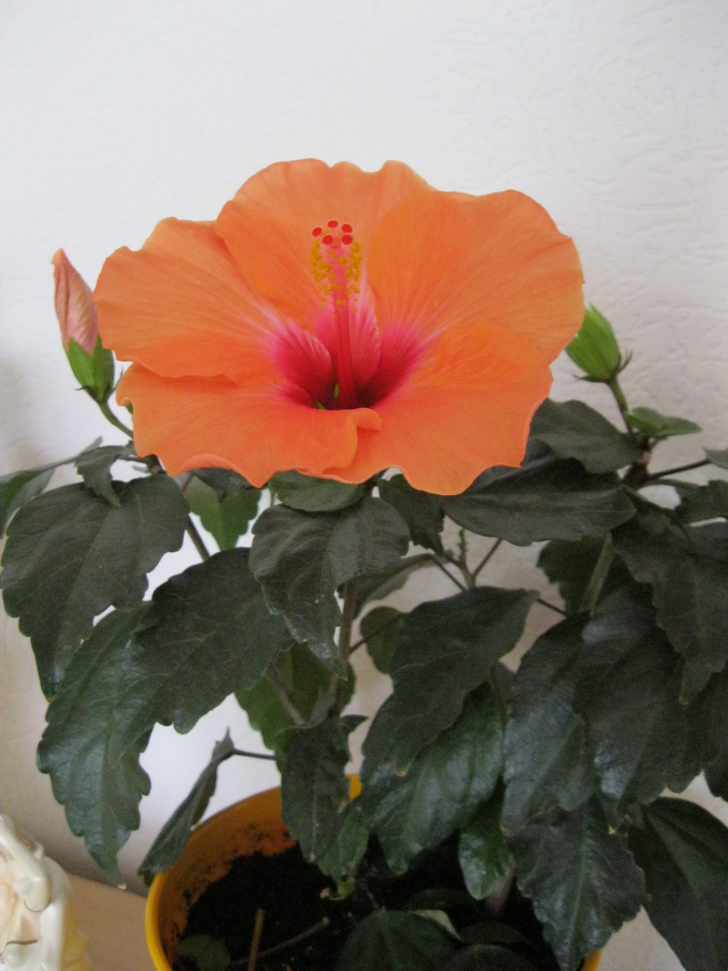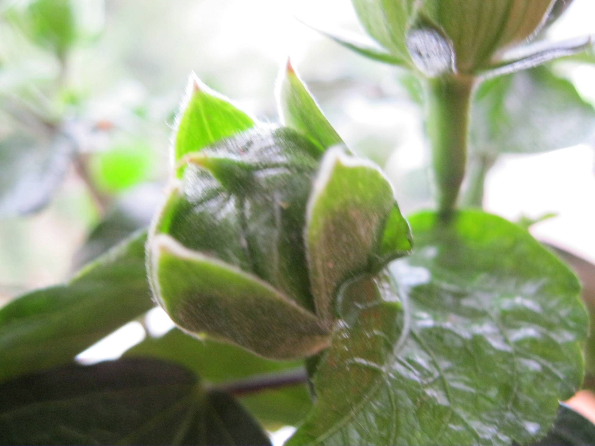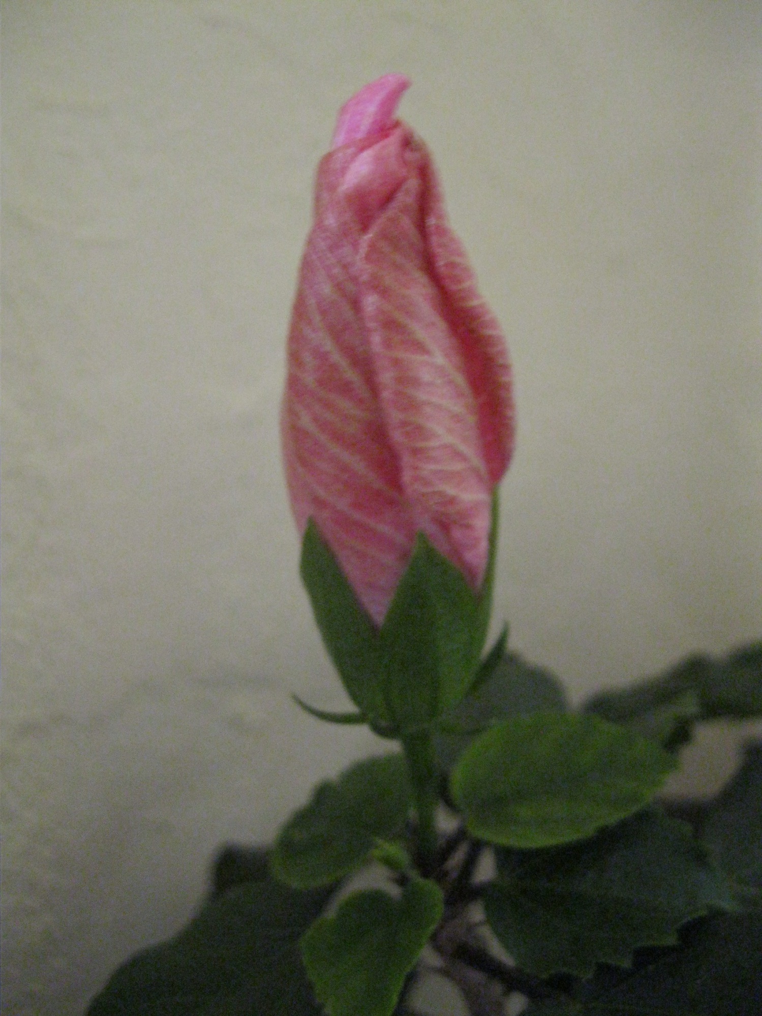 Mein panaschierter Hibiskus bildet seine erste Blüte aus Leider ist es weit und breit die einzige Knospe und ich hoffe, daß sie von meinen Katzen unentdeckt bleibt. Ansonsten werd ich nämlich mal richtig