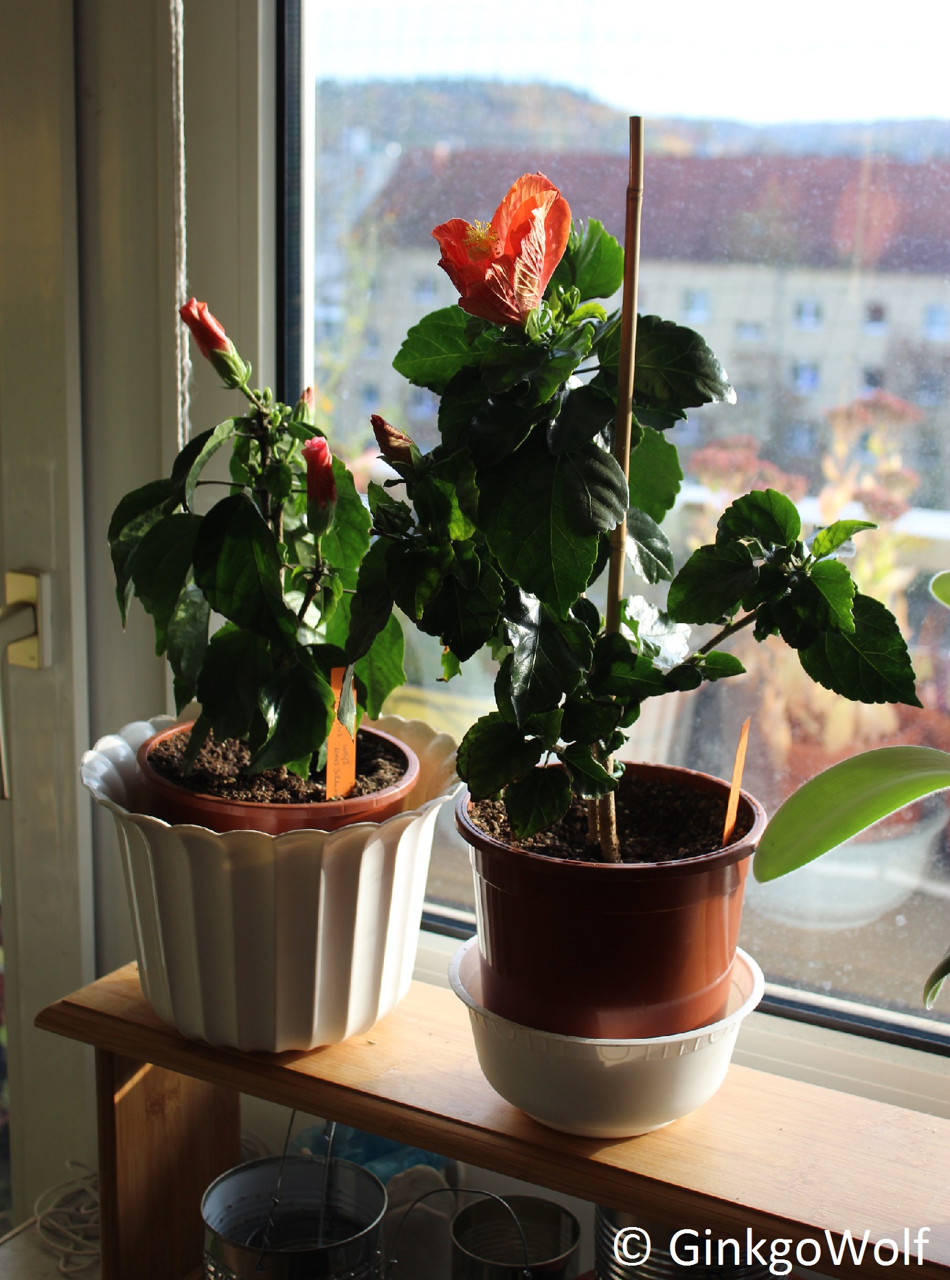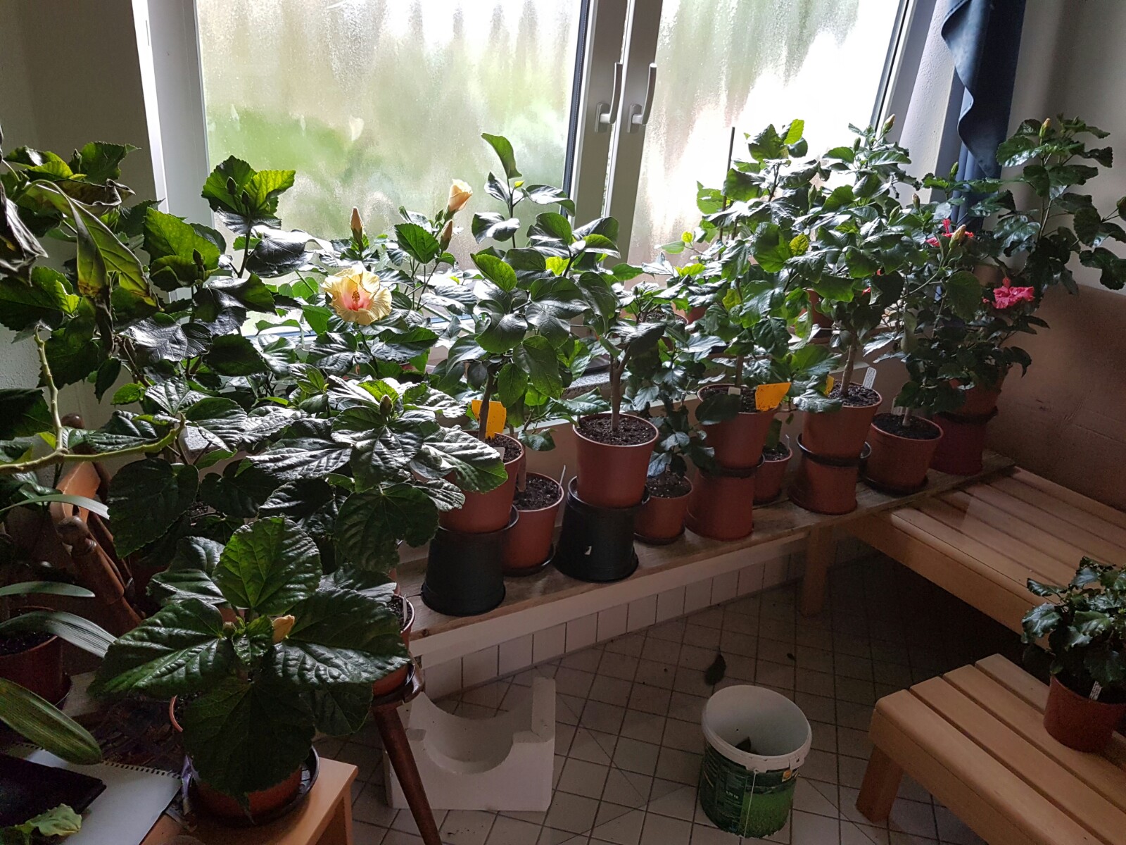 Es ist Dienstag, den ersten November 2016. Anstelle von Schnee dens am ersten November schon oft genug gab gibt's das erfreuliche Häuschen angestrahlt von der warmen Sonne. Aber heut und jetzt ist Schluss. Da heute wohl der letzte Tag ist, wo sich die Außentemperaturen komplett meiner Überwinterungstemperatur angleichen werden, hab ich vorhin alle rein geräumt. Die Tageshöchsttemperatur soll bei uns die nächsten 7 Tage 10 Grad nur selten überschreiten und gegen Wochenende ist Frost angesagt. Das will ich Ihnen nicht antun, zeigen doch jetzt schon länger 'Jeanette Elliff';'Acapulco Gold';'Simple Pleasures' und weitere extrem instabiles Gewebe und weiche Blätter. 'Tahitian Taui' ist wohl von allen am Empfindlichsten und zeigt schon länger massive Mosaikerscheinungen und aufgehellte, weiche Blätter. Zum Glück sind die Verfärbungen schon wenige Stunden nach dem Einräumen vergangen. Wie schnell das Gewebe bei 'Jeanette Elliff' und Co. wieder Stabil wird bleibt abzuwarten...