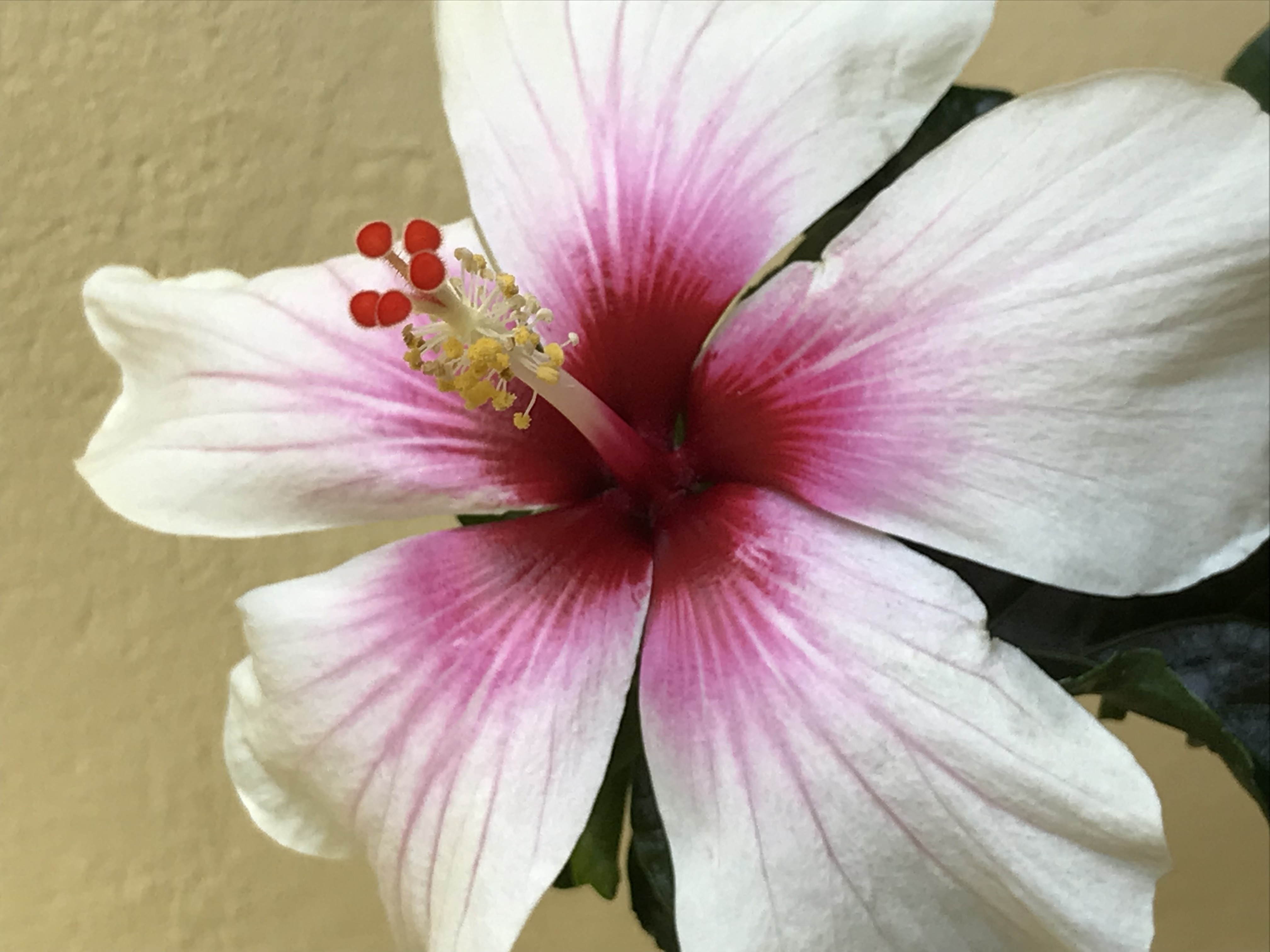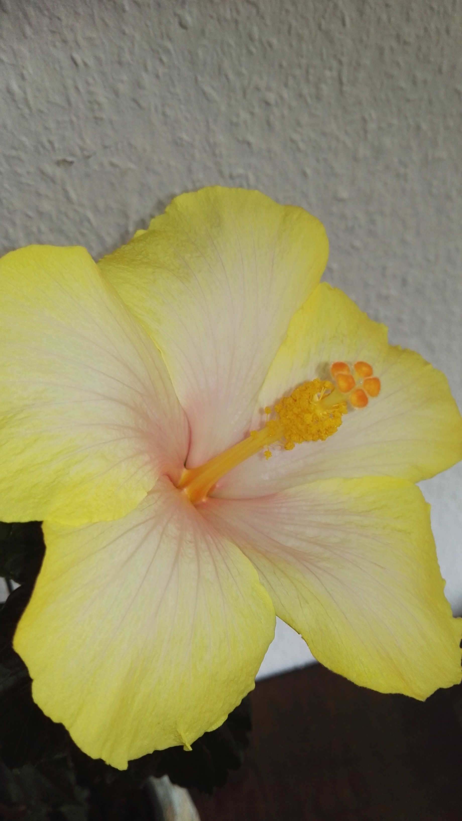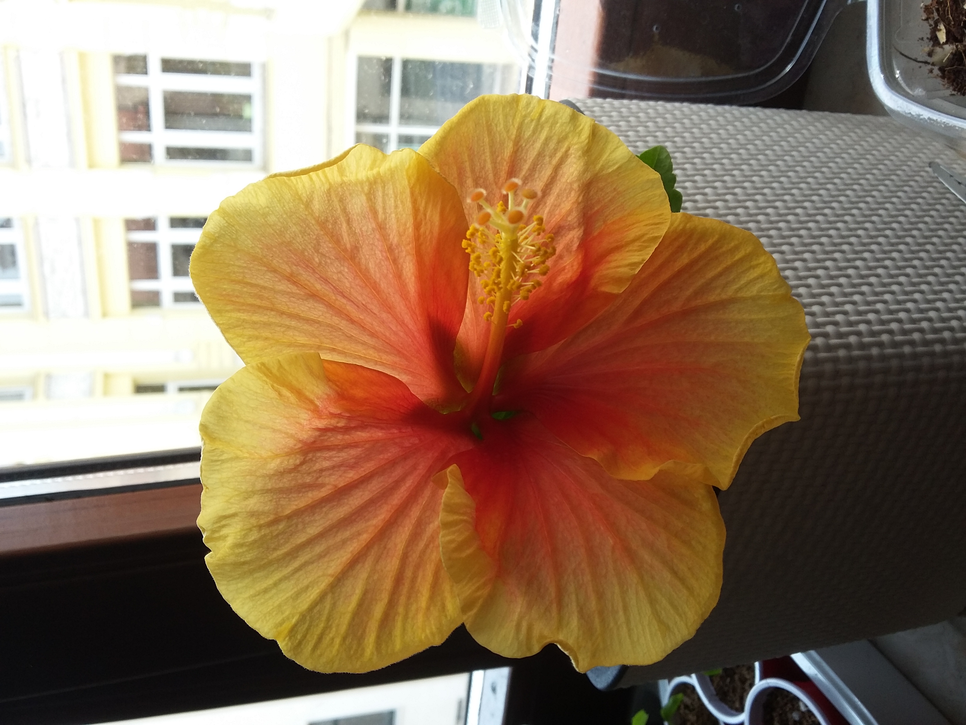 Mein eigentlich gelber Hibiskus macht manchmal eine zweifarbige Blüte.