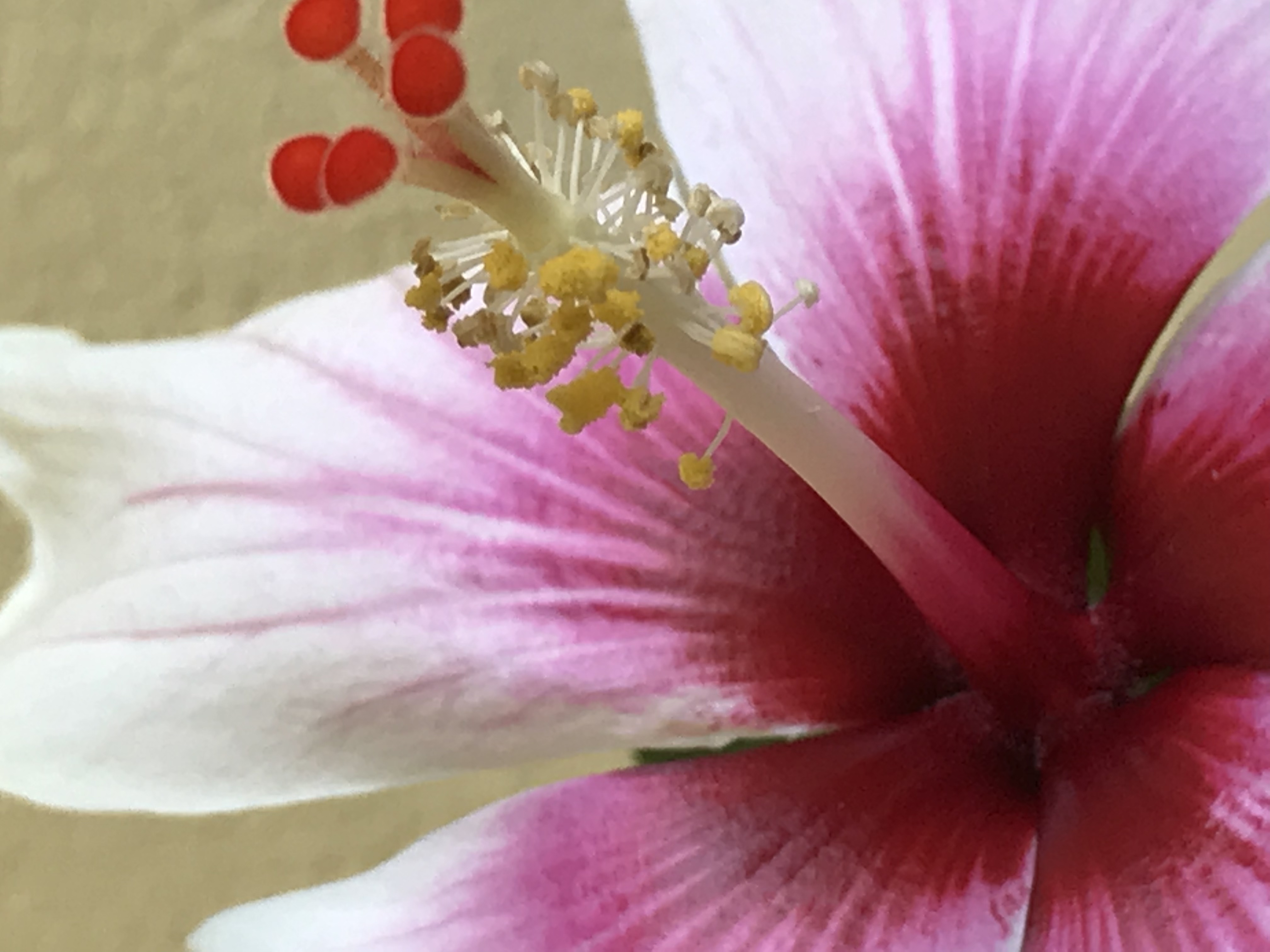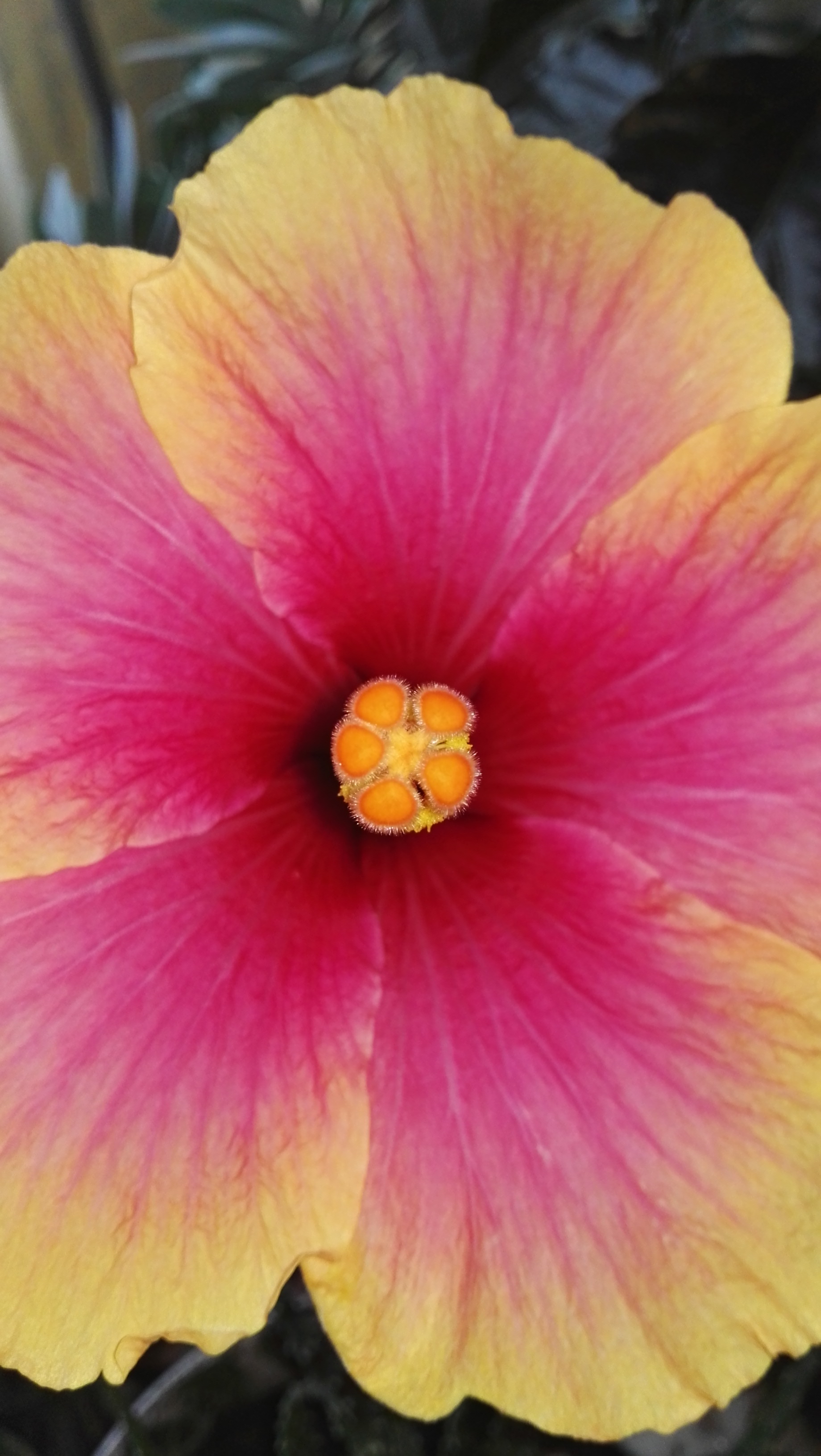 Mein eigentlich gelber Hibiskus macht manchmal eine zweifarbige Blüte.
