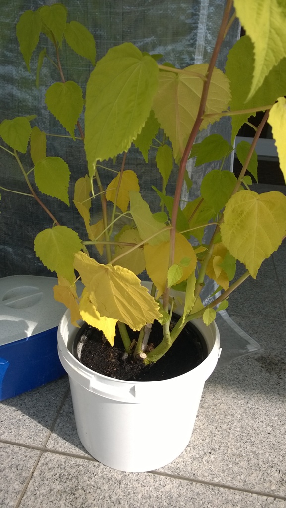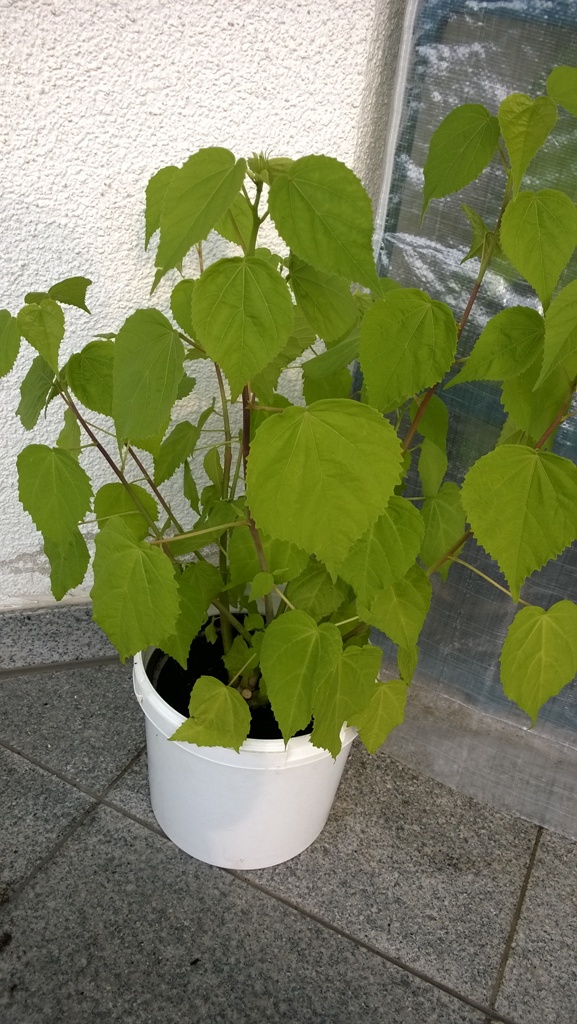 So, jetzt hab ich mal Bilder gemacht von meinem Hibi. Bitte nicht wundern, ich weiß, dass der Topf etwas klein ist, nach der Blüte topfe ich ihn um und verpasse ihm einen Rückschnitt.