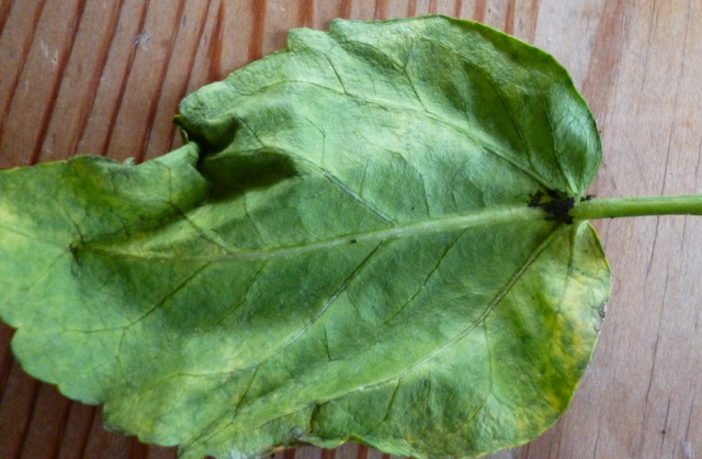die weiße pünktchen auf der blatt oberseite ist kein ungeziefer o.ä., das blatt war schon im abfalleimer...