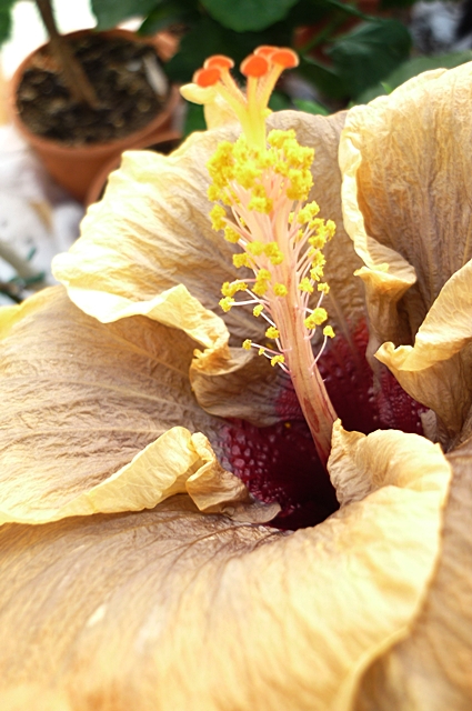 Blöder Sturm, blöde Gewitter! Mein armer Cosmic Dancer - zur Zeit seines Zeichens großer Liebling unter den Neuhibis ob Blüten und schönen Wuchses - ist jetzt schon zum 2. Mal von der Fensterbank geweht worden. Einmal während meines Kurzurlaubs, da dachte ich noch, da wären Vögel am Werk gewesen, aber jetzt gerade schon wieder! Bisher ohne sichtbaren Schaden, aber habe ihm jetzt mal gleich 2 zusätzliche, schwere Übertöpfe gegönnt. Muss dann sehr aufpassen mit Gießen, aber solange der nicht mehr geht... Der hat schon wieder so viele Knospen!
