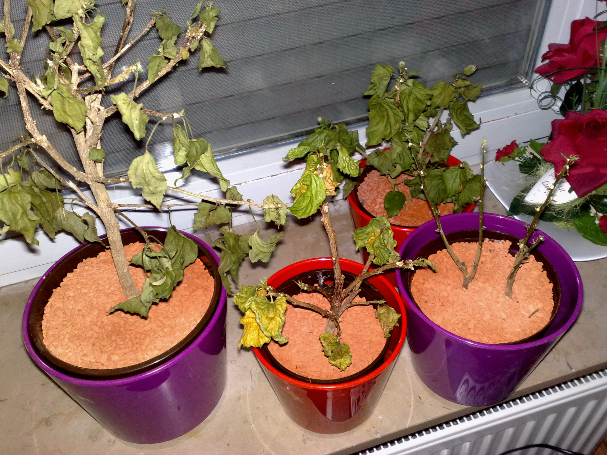 und alle 4 haben erst wabbelige runtehängende Blätter bekommen, danach wurden sie alle trocken und fallen nun ab. Ein Hibiskus hat überhaupt keine Blätter mehr und die anderen nur noch ganz wenige und komplett vertrognete.
