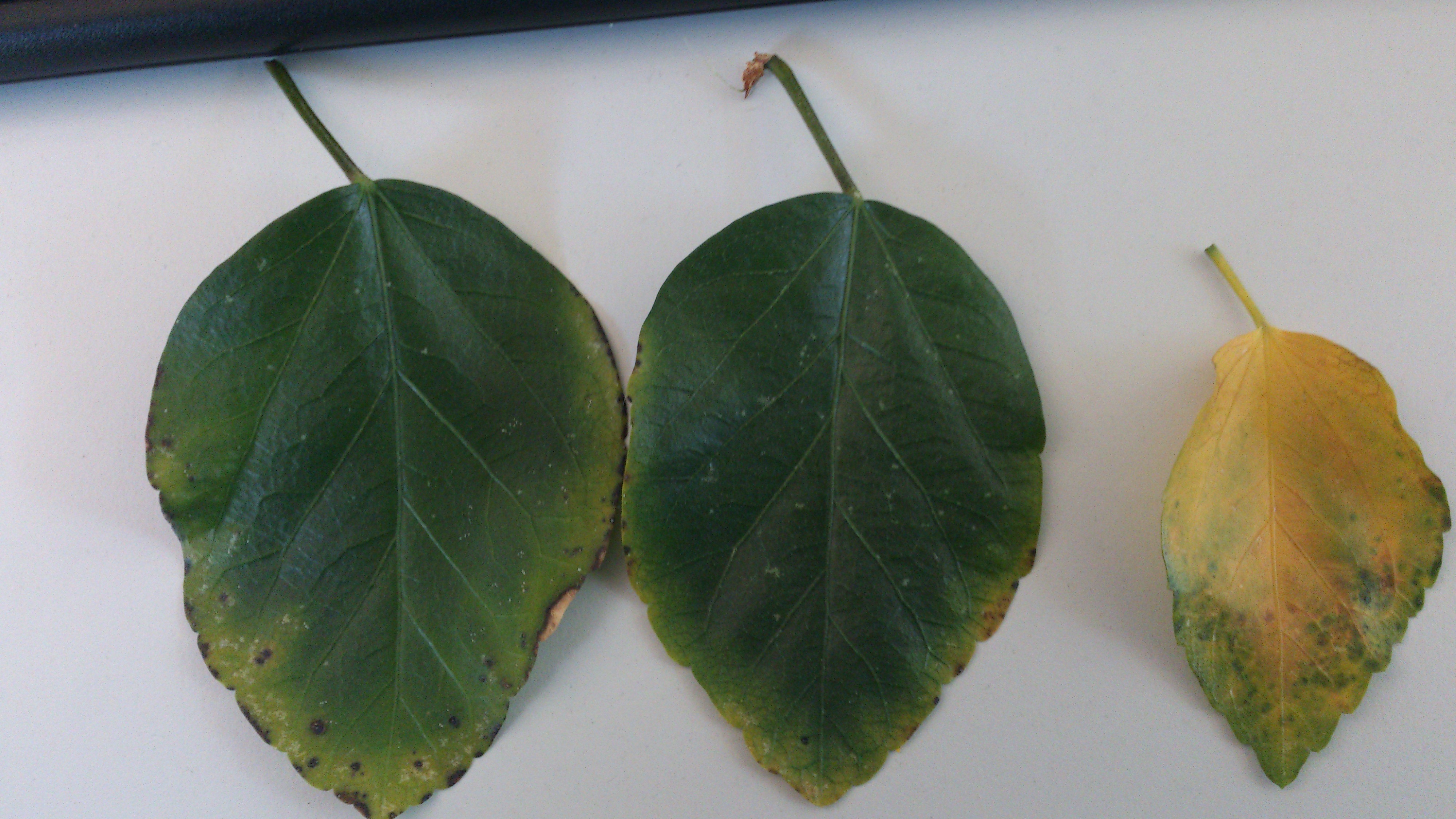 Die Blätter bekommen schwarze Pünktchen an den Rändern. Auf der Blattoberseite sind kleine weiße Brösel zu erkennen. Deswegen dachte ich an einen Tierbefall. Die schwarzen Pünktchen fangen an Knoten zu bilden und das Blatt wird vom Rand her Richtung Mitte gelb. Wenn es vollkommen gelb und grün getüpfelt ist dann fällt es ab.