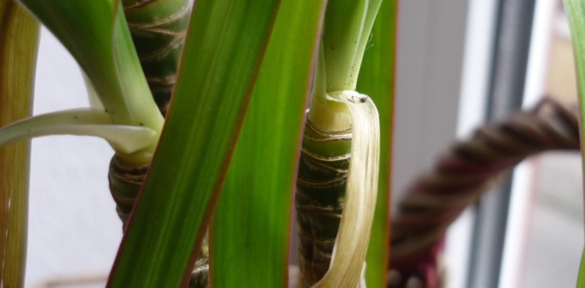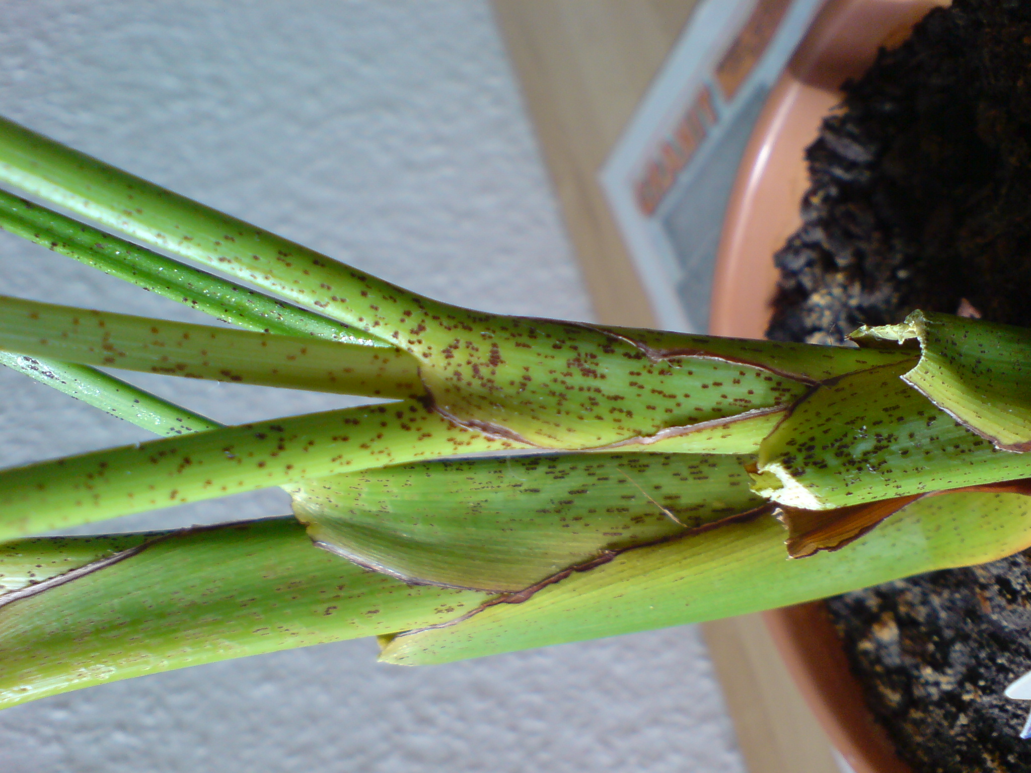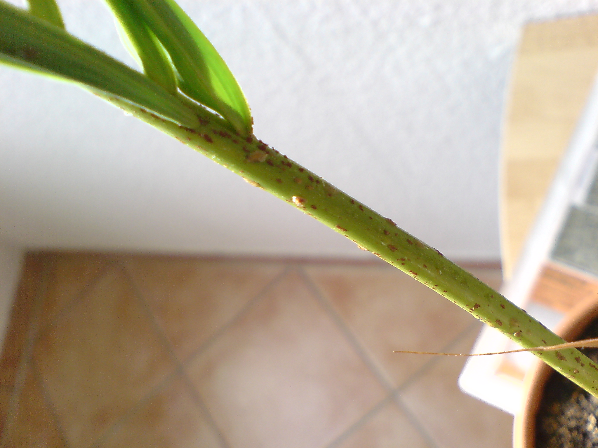 Ich habe bereits begonnen die Palme mit Seifenwasser abzuwischen. Damit gehen auch die schwarzen Punkte ab wie auf dem Bild vom Stamm zu sehen.....dort hab ich die eine Hälfte abgewischt, die andere nicht. Mir iats auch aufgefallen das die neuaustreibenden Äste in der Spitze von anfang an braun sind und die Äste immer kleiner zu werden scheinen.