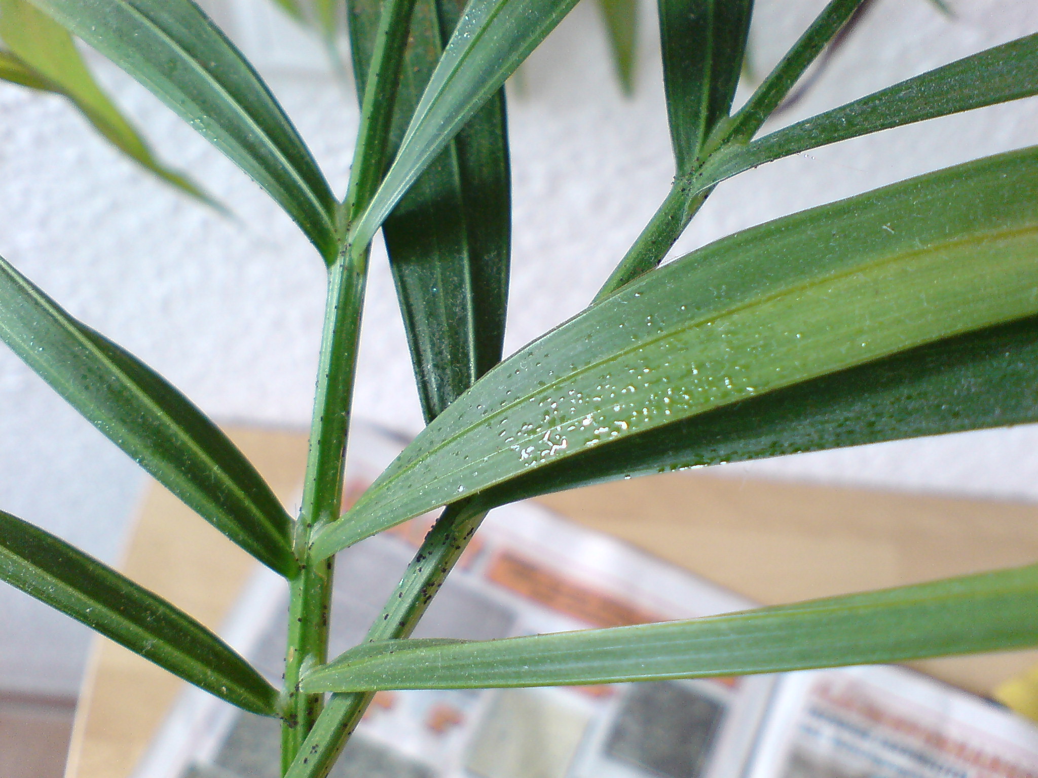 Nichts destotrotz weißt meine Areca Plame seit einiger Zeit schwarze Punkte auf dem Stamm und den "Ästen" auf. Zusätzlich dazu hab ich gemerkt das die gesamte Palme von einer klebrigen Substanz überzogen wird und selbst die Fensterbank stark klebrig ist.