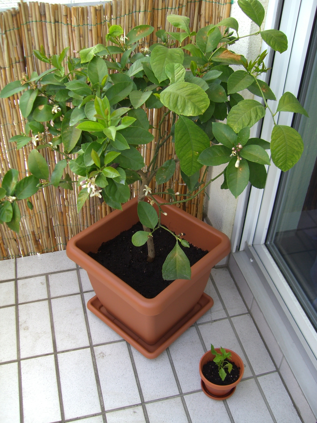 Als keine Frostgefahr mehr bestand ging das Bäumchen auf den Balkon. Volle Sonne und manchmal stark windig. Einen anderen Standort kann ich ihm leider nicht bieten.